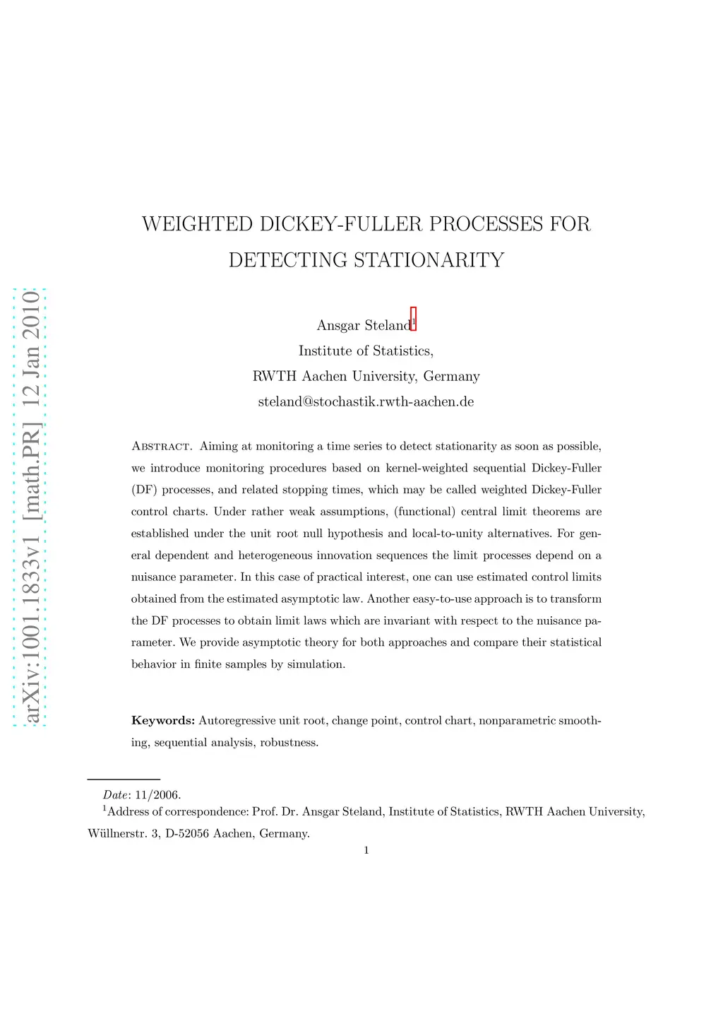 Aiming at monitoring a time series to detect stationarity as soon as possible, we introduce monitoring procedures based on kernel-weighted sequential Dickey-Fuller (DF) processes, and related stopping times, which may be called weighted Dickey-Fuller control charts. Under rather weak assumptions, (functional) central limit theorems are established under the unit root null hypothesis and local-to-unity alternatives. For gen- eral dependent and heterogeneous innovation sequences the limit processes depend on a nuisance parameter. In this case of practical interest, one can use estimated control limits obtained from the estimated asymptotic law. Another easy-to-use approach is to transform the DF processes to obtain limit laws which are invariant with respect to the nuisance pa- rameter. We provide asymptotic theory for both approaches and compare their statistical behavior in finite samples by simulation.