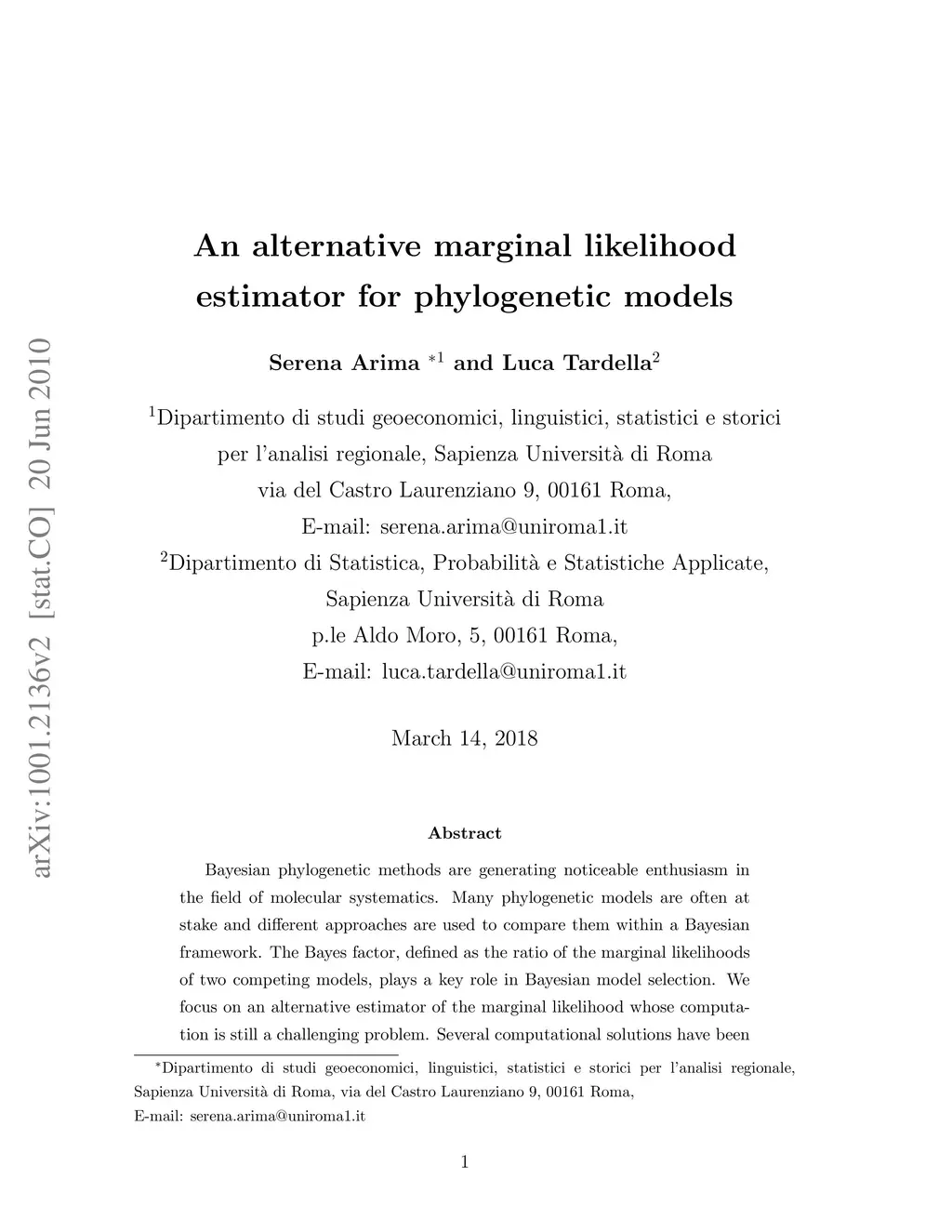 Bayesian phylogenetic methods are generating noticeable enthusiasm in the field of molecular systematics. Many phylogenetic models are often at stake and different approaches are used to compare them within a Bayesian framework. The Bayes factor, defined as the ratio of the marginal likelihoods of two competing models, plays a key role in Bayesian model selection. We focus on an alternative estimator of the marginal likelihood whose computation is still a challenging problem. Several computational solutions have been proposed none of which can be considered outperforming the others simultaneously in terms of simplicity of implementation, computational burden and precision of the estimates. Practitioners and researchers, often led by available software, have privileged so far the simplicity of the harmonic mean estimator (HM) and the arithmetic mean estimator (AM). However it is known that the resulting estimates of the Bayesian evidence in favor of one model are biased and often inaccurate up to having an infinite variance so that the reliability of the corresponding conclusions is doubtful. Our new implementation of the generalized harmonic mean (GHM) idea recycles MCMC simulations from the posterior, shares the computational simplicity of the original HM estimator, but, unlike it, overcomes the infinite variance issue. The alternative estimator is applied to simulated phylogenetic data and produces fully satisfactory results outperforming those simple estimators currently provided by most of the publicly available software.