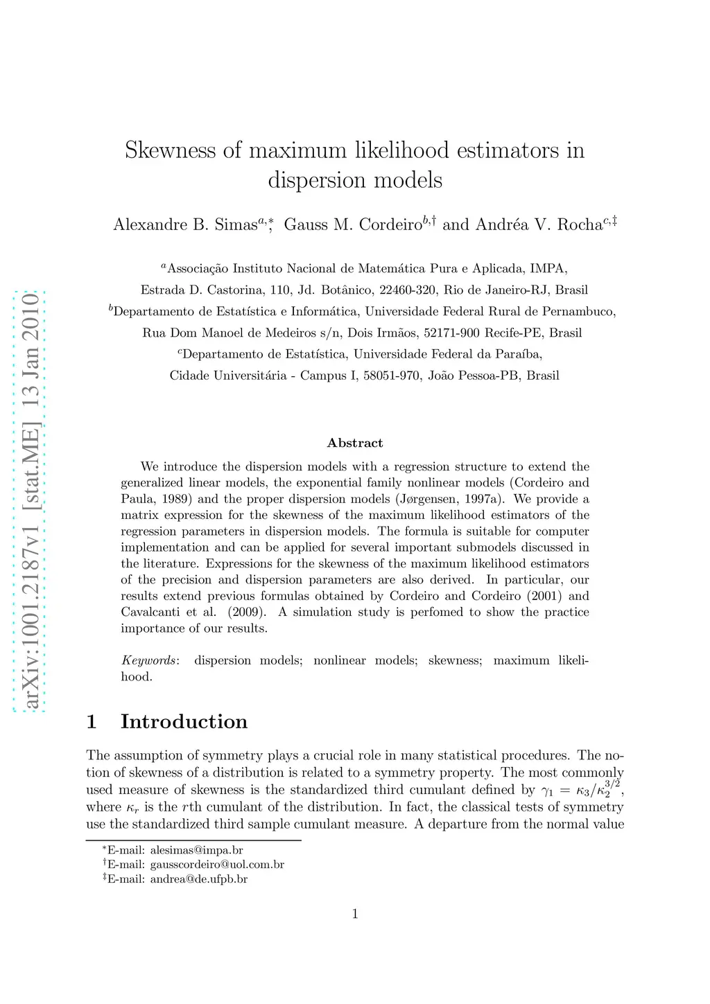 We introduce the dispersion models with a regression structure to extend the generalized linear models, the exponential family nonlinear models (Cordeiro and Paula, 1989) and the proper dispersion models (J{\o}rgensen, 1997a). We provide a matrix expression for the skewness of the maximum likelihood estimators of the regression parameters in dispersion models. The formula is suitable for computer implementation and can be applied for several important submodels discussed in the literature. Expressions for the skewness of the maximum likelihood estimators of the precision and dispersion parameters are also derived. In particular, our results extend previous formulas obtained by Cordeiro and Cordeiro (2001) and Cavalcanti et al. (2009). A simulation study is perfomed to show the practice importance of our results.