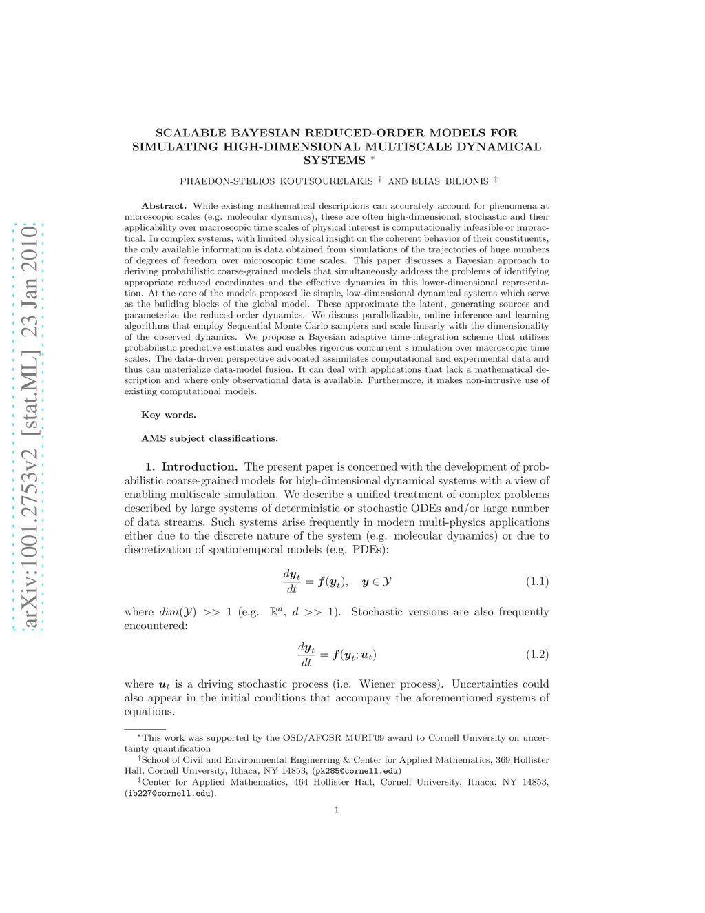 While existing mathematical descriptions can accurately account for phenomena at microscopic scales (e.g. molecular dynamics), these are often high-dimensional, stochastic and their applicability over macroscopic time scales of physical interest is computationally infeasible or impractical. In complex systems, with limited physical insight on the coherent behavior of their constituents, the only available information is data obtained from simulations of the trajectories of huge numbers of degrees of freedom over microscopic time scales. This paper discusses a Bayesian approach to deriving probabilistic coarse-grained models that simultaneously address the problems of identifying appropriate reduced coordinates and the effective dynamics in this lower-dimensional representation. At the core of the models proposed lie simple, low-dimensional dynamical systems which serve as the building blocks of the global model. These approximate the latent, generating sources and parameterize the reduced-order dynamics. We discuss parallelizable, online inference and learning algorithms that employ Sequential Monte Carlo samplers and scale linearly with the dimensionality of the observed dynamics. We propose a Bayesian adaptive time-integration scheme that utilizes probabilistic predictive estimates and enables rigorous concurrent s imulation over macroscopic time scales. The data-driven perspective advocated assimilates computational and experimental data and thus can materialize data-model fusion. It can deal with applications that lack a mathematical description and where only observational data is available. Furthermore, it makes non-intrusive use of existing computational models.