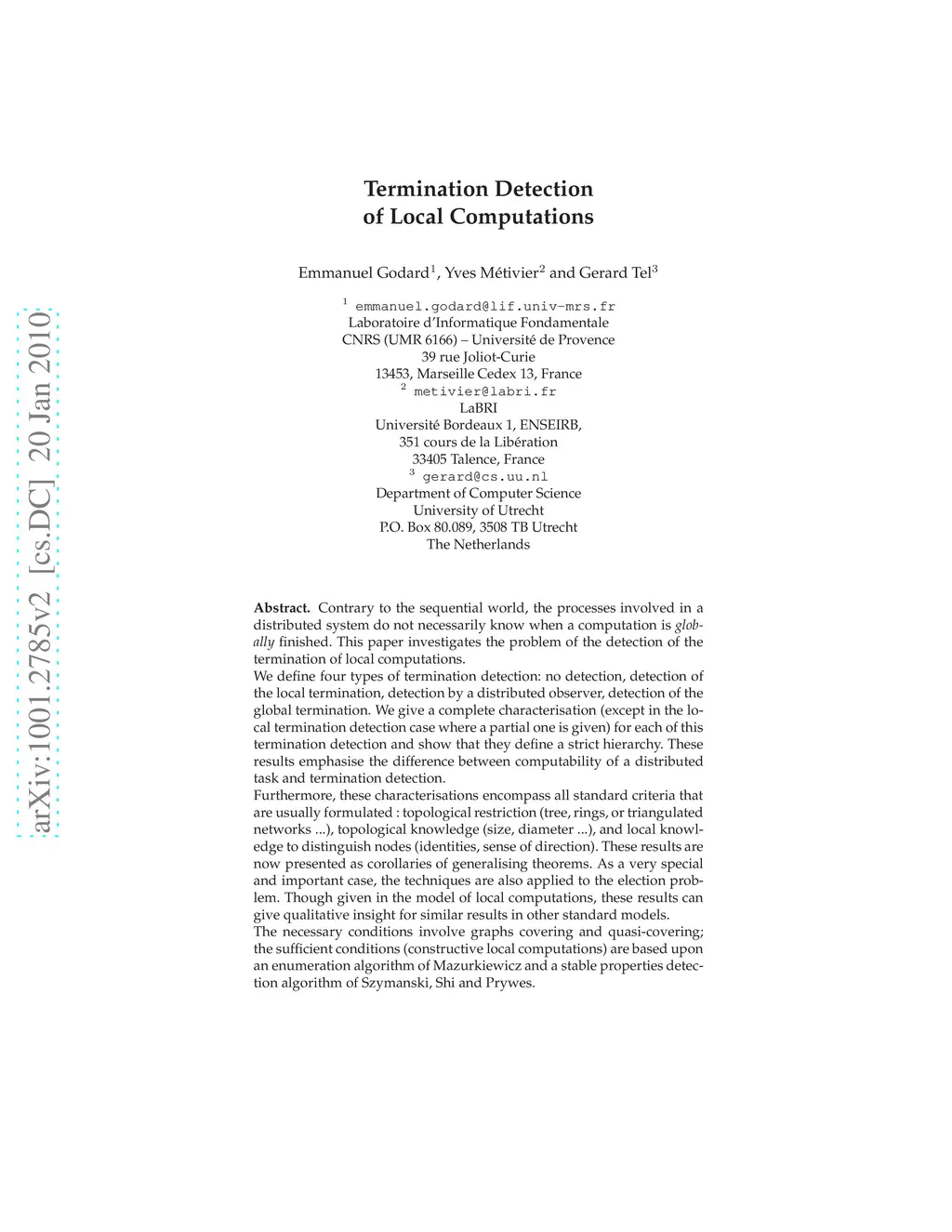 Contrary to the sequential world, the processes involved in a distributed system do not necessarily know when a computation is globally finished. This paper investigates the problem of the detection of the termination of local computations. We define four types of termination detection: no detection, detection of the local termination, detection by a distributed observer, detection of the global termination. We give a complete characterisation (except in the local termination detection case where a partial one is given) for each of this termination detection and show that they define a strict hierarchy. These results emphasise the difference between computability of a distributed task and termination detection. Furthermore, these characterisations encompass all standard criteria that are usually formulated : topological restriction (tree, rings, or triangu- lated networks ...), topological knowledge (size, diameter ...), and local knowledge to distinguish nodes (identities, sense of direction). These results are now presented as corollaries of generalising theorems. As a very special and important case, the techniques are also applied to the election problem. Though given in the model of local computations, these results can give qualitative insight for similar results in other standard models. The necessary conditions involve graphs covering and quasi-covering; the sufficient conditions (constructive local computations) are based upon an enumeration algorithm of Mazurkiewicz and a stable properties detection algorithm of Szymanski, Shi and Prywes.