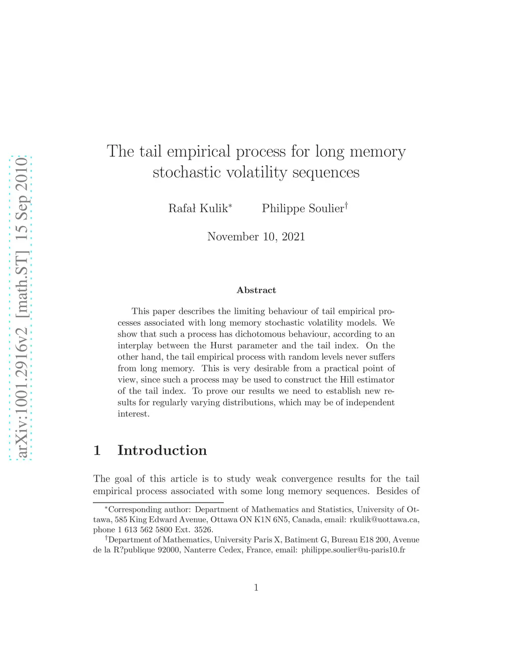 This paper describes limiting behaviour of tail empirical process associated with long memory stochastic volatility models. We show that such process has dichotomous behaviour, according to an interplay between a Hurst parameter and a tail index. In particular, the limit may be non-Gaussian and/or degenerate, indicating an influence of long memory. On the other hand, tail empirical process with random levels never suffers from long memory. This is very desirable from a practical point of view, since such the process may be used to construct Hill estimator of the tail index. To prove our results we need to establish several new results for regularly varying distribution functions, which may be of independent interest.