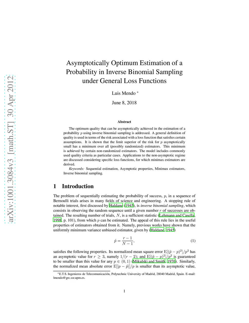 The optimum quality that can be asymptotically achieved in the estimation of a probability p using inverse binomial sampling is addressed. A general definition of quality is used in terms of the risk associated with a loss function that satisfies certain assumptions. It is shown that the limit superior of the risk for p asymptotically small has a minimum over all (possibly randomized) estimators. This minimum is achieved by certain non-randomized estimators. The model includes commonly used quality criteria as particular cases. Applications to the non-asymptotic regime are discussed considering specific loss functions, for which minimax estimators are derived.