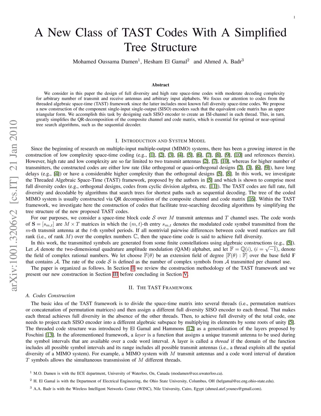 We consider in this paper the design of full diversity and high rate space-time codes with moderate decoding complexity for arbitrary number of transmit and receive antennas and arbitrary input alphabets. We focus our attention to codes from the threaded algebraic space-time (TAST) framework since the latter includes most known full diversity space-time codes. We propose a new construction of the component single-input single-output (SISO) encoders such that the equivalent code matrix has an upper triangular form. We accomplish this task by designing each SISO encoder to create an ISI-channel in each thread. This, in turn, greatly simplifies the QR-decomposition of the composite channel and code matrix, which is essential for optimal or near-optimal tree search algorithms, such as the sequential decoder.