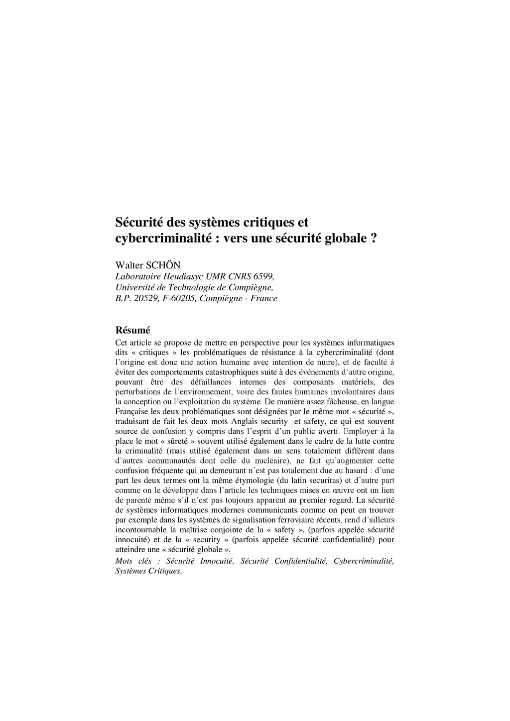 For modern critical systems, it is necessary to consider their ability to avoid catastrophic behavior following fortuitous events such as internal failures in hardware components, environmental disturbances or even involuntary human error in the design and operation, but also non fortuitous events such as malicious attacks. Unfortunately, in French the same word "s\écurit\é" is used to cover two different problematics, what in English is expressed in two different words : safety and security. The interconnected modern information systems, such as rail traffic signalling systems point out the need to deal in an overall way with both safety and security