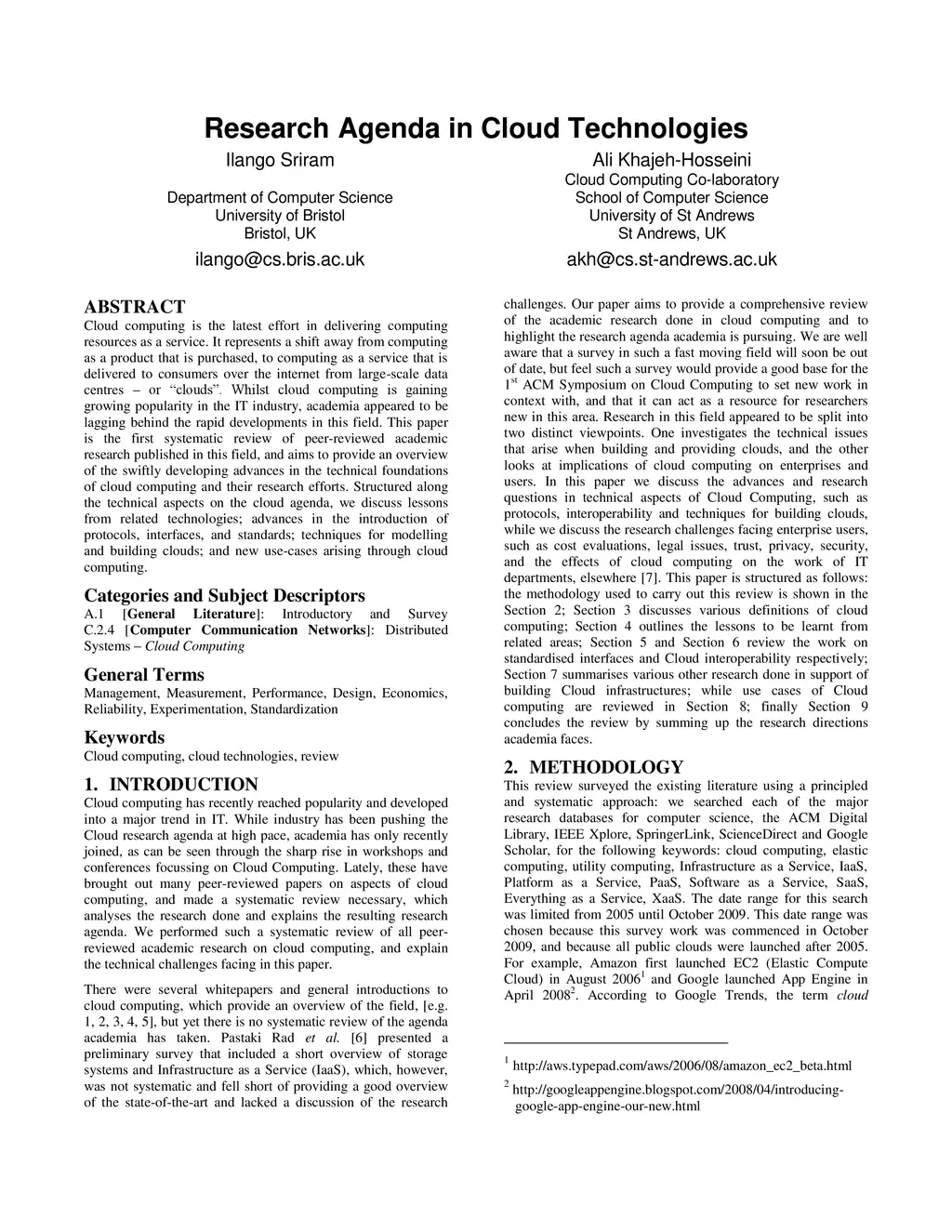Cloud computing is the latest effort in delivering computing resources as a service. It represents a shift away from computing as a product that is purchased, to computing as a service that is delivered to consumers over the internet from large-scale data centres - or "clouds". Whilst cloud computing is gaining growing popularity in the IT industry, academia appeared to be lagging behind the rapid developments in this field. This paper is the first systematic review of peer-reviewed academic research published in this field, and aims to provide an overview of the swiftly developing advances in the technical foundations of cloud computing and their research efforts. Structured along the technical aspects on the cloud agenda, we discuss lessons from related technologies; advances in the introduction of protocols, interfaces, and standards; techniques for modelling and building clouds; and new use-cases arising through cloud computing.