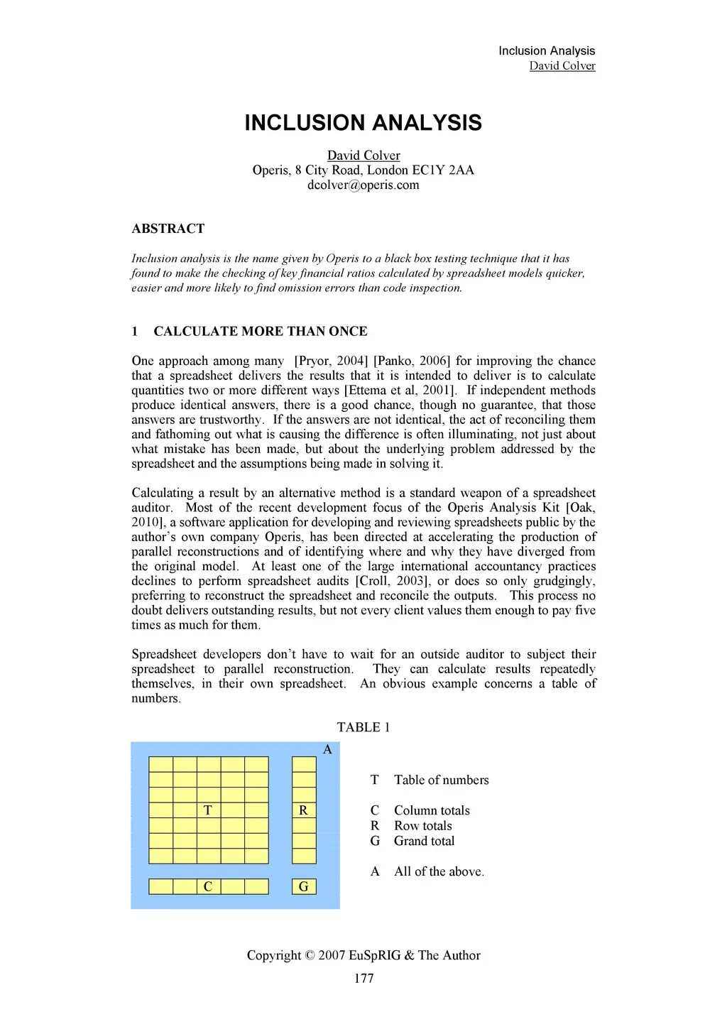 Inclusion analysis is the name given by Operis to a black box testing technique that it has found to make the checking of key financial ratios calculated by spreadsheet models quicker, easier and more likely to find omission errors than code inspection.