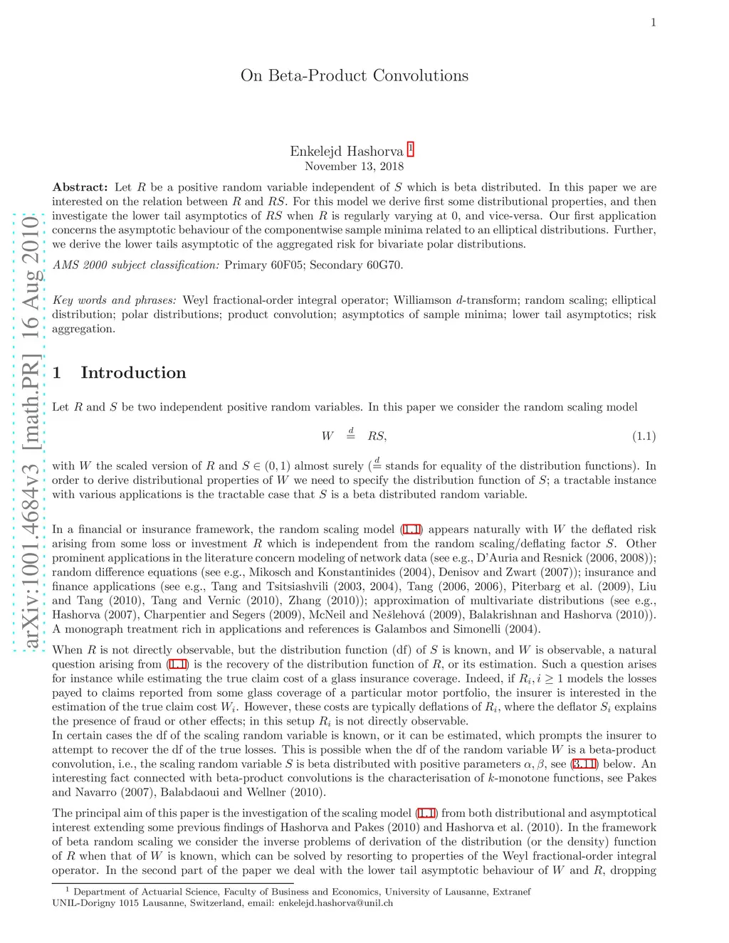 Let R be a positive random variable independent of S which is beta distributed. In this paper we are interested on the relation between the distribution function of R and that of RS. For this model we derive first some distributional properties, and then investigate the lower tail asymptotics of RS when R is regularly varying at 0, and vice-versa. Our first application concerns the asymptotic behaviour of the componentwise sample minima related to an elliptical distributions. Further, we derive the lower tails asymptotic of the aggregated risk for bivariate polar distributions.