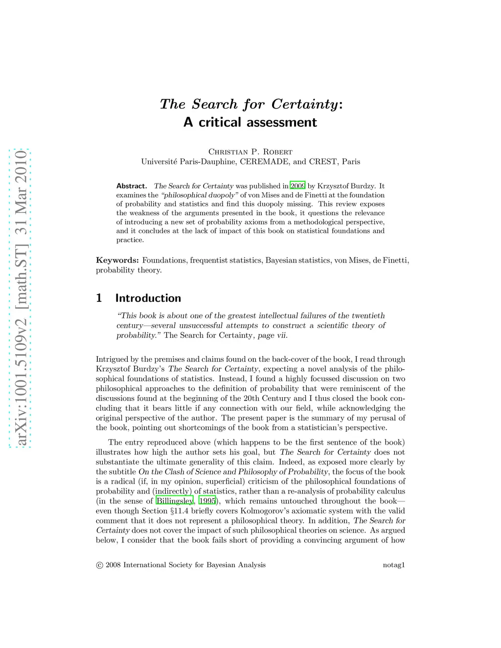 The Search for Certainty was published in 2009 by Krzysztof Burdzy. It examines the "philosophical duopoly" of von Mises and de Finetti at the foundation of probability and statistics and find this duopoly missing. This review exposes the weakness of the arguments presented in the book, it questions the relevance of introducing a new set of probability axioms from a methodological perspective, and it concludes at the lack of impact of this book on statistical foundations and practice.