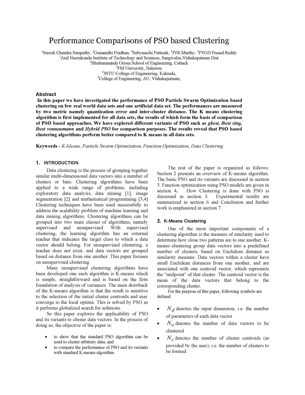 In this paper we have investigated the performance of PSO Particle Swarm Optimization based clustering on few real world data sets and one artificial data set. The performances are measured by two metric namely quantization error and inter-cluster distance. The K means clustering algorithm is first implemented for all data sets, the results of which form the basis of comparison of PSO based approaches. We have explored different variants of PSO such as gbest, lbest ring, lbest vonneumann and Hybrid PSO for comparison purposes. The results reveal that PSO based clustering algorithms perform better compared to K means in all data sets.