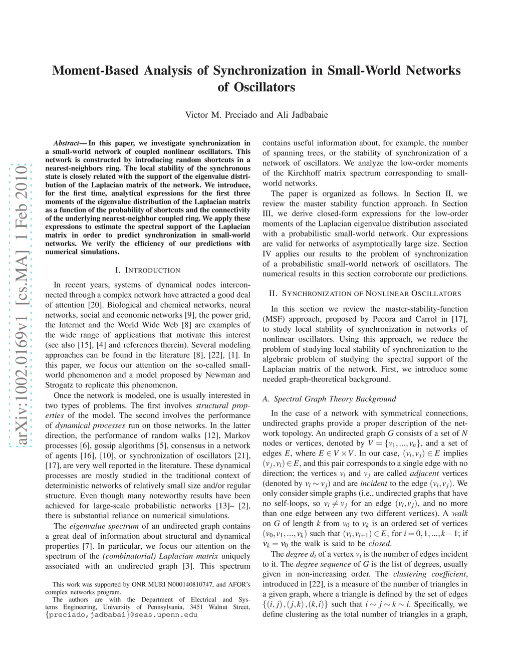 In this paper, we investigate synchronization in a small-world network of coupled nonlinear oscillators. This network is constructed by introducing random shortcuts in a nearest-neighbors ring. The local stability of the synchronous state is closely related with the support of the eigenvalue distribution of the Laplacian matrix of the network. We introduce, for the first time, analytical expressions for the first three moments of the eigenvalue distribution of the Laplacian matrix as a function of the probability of shortcuts and the connectivity of the underlying nearest-neighbor coupled ring. We apply these expressions to estimate the spectral support of the Laplacian matrix in order to predict synchronization in small-world networks. We verify the efficiency of our predictions with numerical simulations.