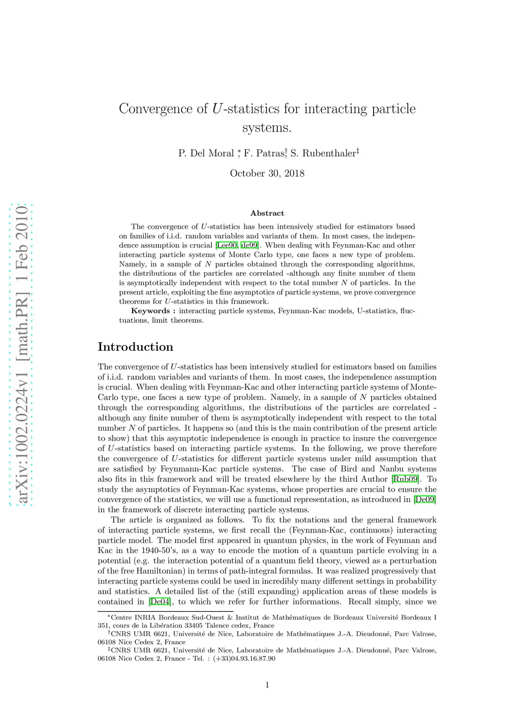 The convergence of U-statistics has been intensively studied for estimators based on families of i.i.d. random variables and variants of them. In most cases, the independence assumption is crucial [Lee90, de99]. When dealing with Feynman-Kac and other interacting particle systems of Monte Carlo type, one faces a new type of problem. Namely, in a sample of N particles obtained through the corresponding algorithms, the distributions of the particles are correlated -although any finite number of them is asymptotically independent with respect to the total number N of particles. In the present article, exploiting the fine asymptotics of particle systems, we prove convergence theorems for U-statistics in this framework.