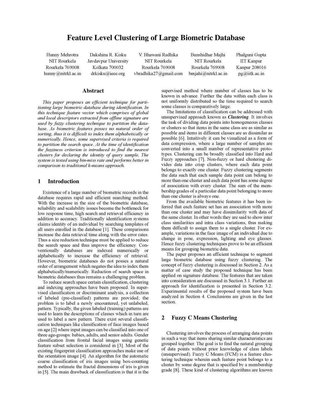This paper proposes an efficient technique for partitioning large biometric database during identification. In this technique feature vector which comprises of global and local descriptors extracted from offline signature are used by fuzzy clustering technique to partition the database. As biometric features posses no natural order of sorting, thus it is difficult to index them alphabetically or numerically. Hence, some supervised criteria is required to partition the search space. At the time of identification the fuzziness criterion is introduced to find the nearest clusters for declaring the identity of query sample. The system is tested using bin-miss rate and performs better in comparison to traditional k-means approach.