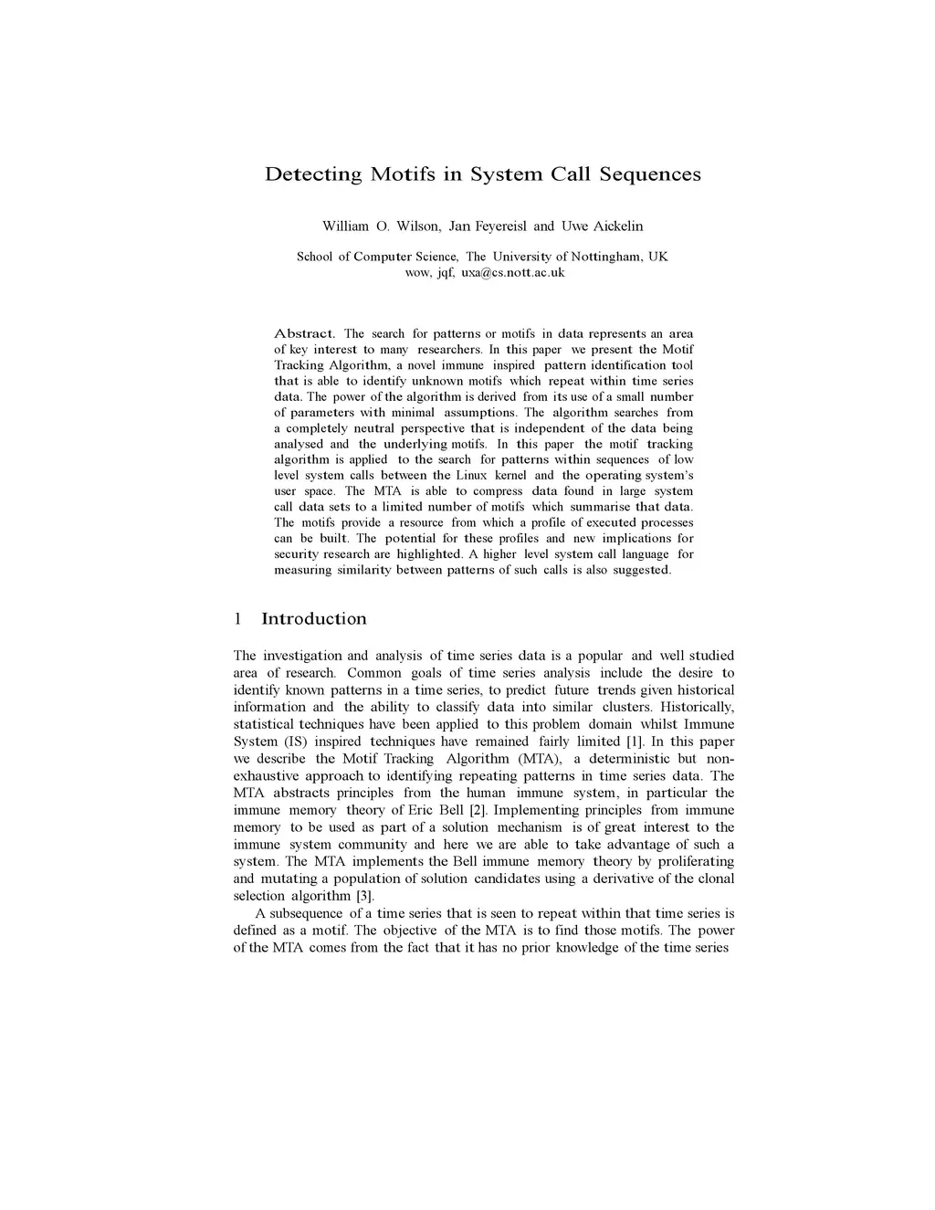 The search for patterns or motifs in data represents an area of key interest to many researchers. In this paper we present the Motif Tracking Algorithm, a novel immune inspired pattern identification tool that is able to identify unknown motifs which repeat within time series data. The power of the algorithm is derived from its use of a small number of parameters with minimal assumptions. The algorithm searches from a completely neutral perspective that is independent of the data being analysed, and the underlying motifs. In this paper the motif tracking algorithm is applied to the search for patterns within sequences of low level system calls between the Linux kernel and the operating system's user space. The MTA is able to compress data found in large system call data sets to a limited number of motifs which summarise that data. The motifs provide a resource from which a profile of executed processes can be built. The potential for these profiles and new implications for security research are highlighted. A higher level call system language for measuring similarity between patterns of such calls is also suggested.