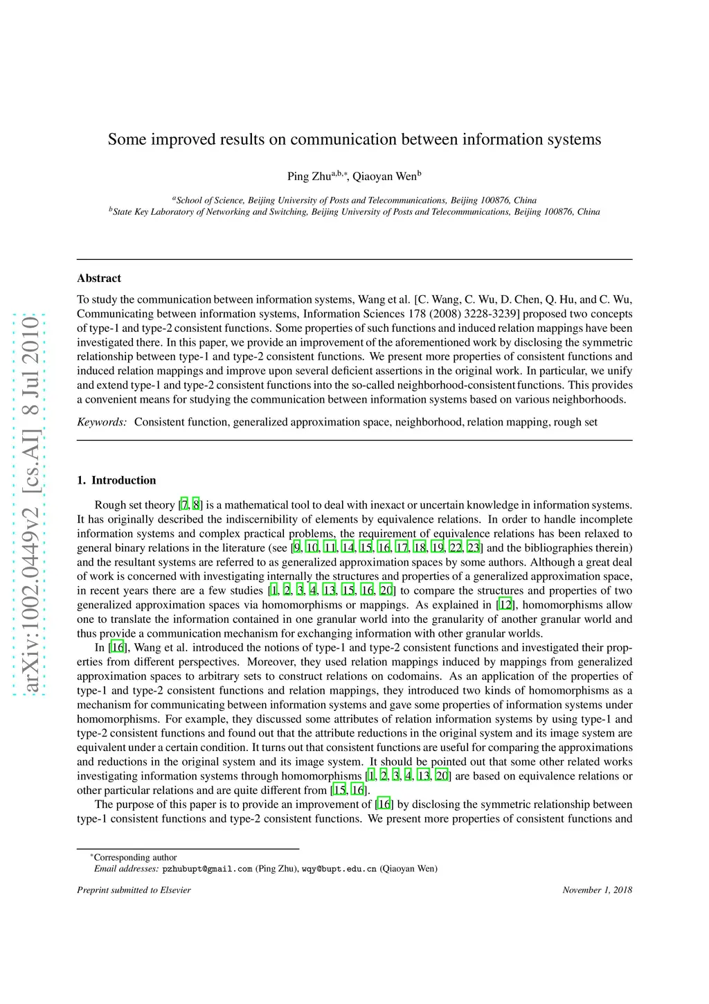 To study the communication between information systems, Wang et al. [C. Wang, C. Wu, D. Chen, Q. Hu, and C. Wu, Communicating between information systems, Information Sciences 178 (2008) 3228-3239] proposed two concepts of type-1 and type-2 consistent functions. Some properties of such functions and induced relation mappings have been investigated there. In this paper, we provide an improvement of the aforementioned work by disclosing the symmetric relationship between type-1 and type-2 consistent functions. We present more properties of consistent functions and induced relation mappings and improve upon several deficient assertions in the original work. In particular, we unify and extend type-1 and type-2 consistent functions into the so-called neighborhood-consistent functions. This provides a convenient means for studying the communication between information systems based on various neighborhoods.