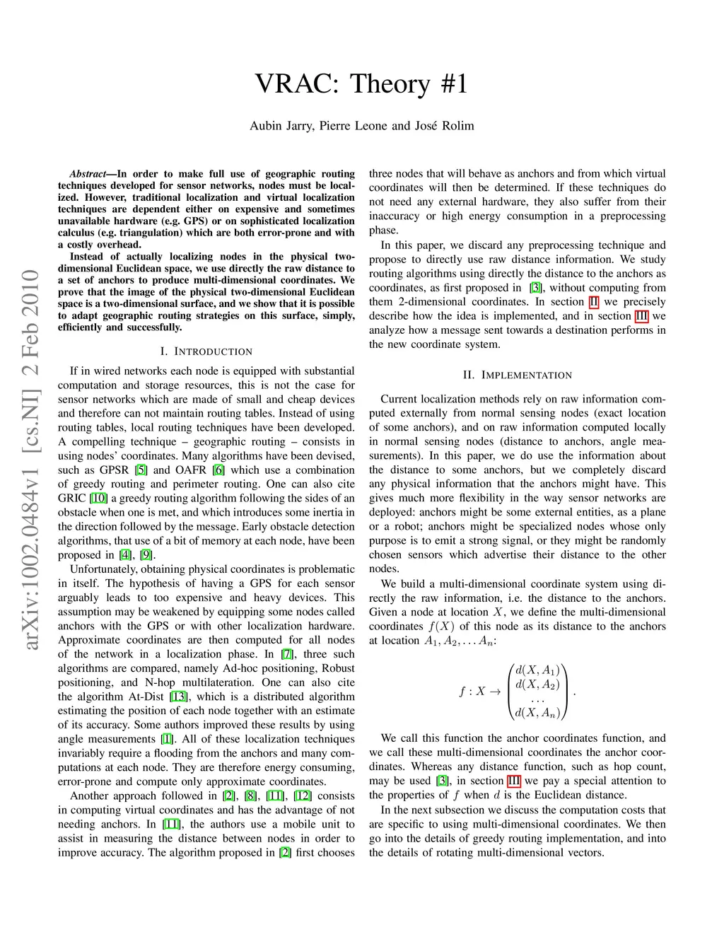 In order to make full use of geographic routing techniques developed for sensor networks, nodes must be localized. However, traditional localization and virtual localization techniques are dependent either on expensive and sometimes unavailable hardware (e.g. GPS) or on sophisticated localization calculus (e.g. triangulation) which are both error-prone and with a costly overhead. Instead of actually localizing nodes in the physical two-dimensional Euclidean space, we use directly the raw distance to a set of anchors to produce multi-dimensional coordinates. We prove that the image of the physical two-dimensional Euclidean space is a two-dimensional surface, and we show that it is possible to adapt geographic routing strategies on this surface, simply, efficiently and successfully.