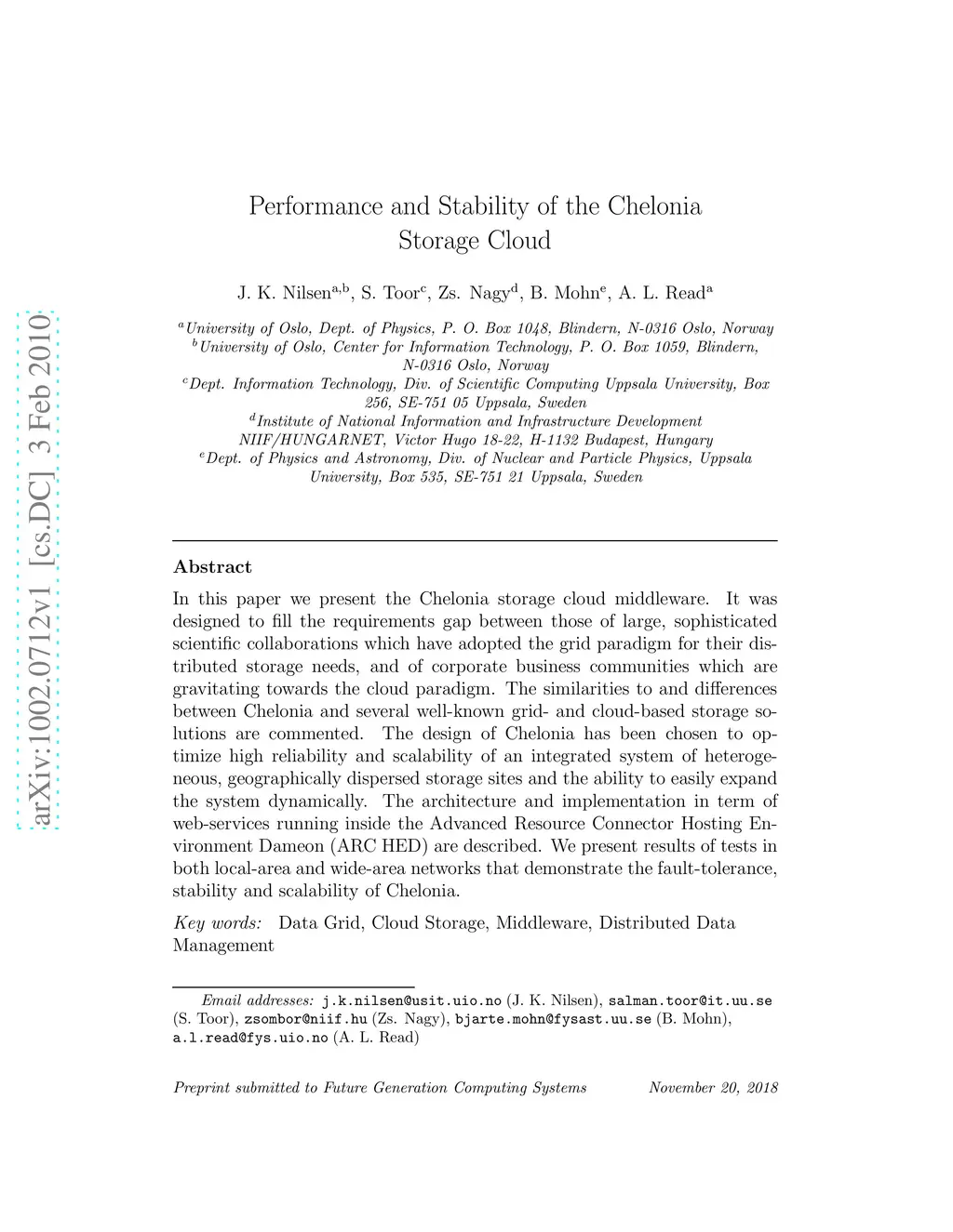 In this paper we present the Chelonia storage cloud middleware. It was designed to fill the requirements gap between those of large, sophisticated scientific collaborations which have adopted the grid paradigm for their distributed storage needs, and of corporate business communities which are gravitating towards the cloud paradigm. The similarities to and differences between Chelonia and several well-known grid- and cloud-based storage solutions are commented. The design of Chelonia has been chosen to optimize high reliability and scalability of an integrated system of heterogeneous, geographically dispersed storage sites and the ability to easily expand the system dynamically. The architecture and implementation in term of web-services running inside the Advanced Resource Connector Hosting Environment Dameon (ARC HED) are described. We present results of tests in both local-area and wide-area networks that demonstrate the fault-tolerance, stability and scalability of Chelonia.