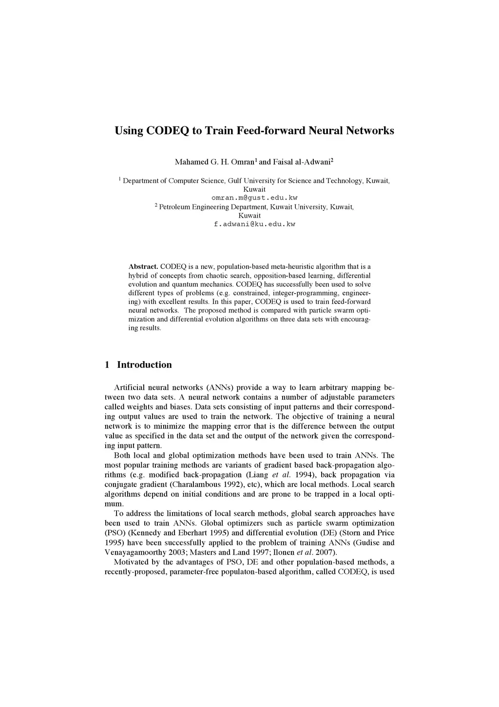 CODEQ is a new, population-based meta-heuristic algorithm that is a hybrid of concepts from chaotic search, opposition-based learning, differential evolution and quantum mechanics. CODEQ has successfully been used to solve different types of problems (e.g. constrained, integer-programming, engineering) with excellent results. In this paper, CODEQ is used to train feed-forward neural networks. The proposed method is compared with particle swarm optimization and differential evolution algorithms on three data sets with encouraging results.