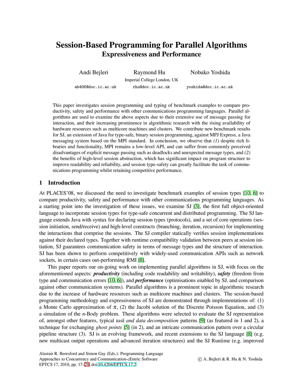 This paper investigates session programming and typing of benchmark examples to compare productivity, safety and performance with other communications programming languages. Parallel algorithms are used to examine the above aspects due to their extensive use of message passing for interaction, and their increasing prominence in algorithmic research with the rising availability of hardware resources such as multicore machines and clusters. We contribute new benchmark results for SJ, an extension of Java for type-safe, binary session programming, against MPJ Express, a Java messaging system based on the MPI standard. In conclusion, we observe that (1) despite rich libraries and functionality, MPI remains a low-level API, and can suffer from commonly perceived disadvantages of explicit message passing such as deadlocks and unexpected message types, and (2) the benefits of high-level session abstraction, which has significant impact on program structure to improve readability and reliability, and session type-safety can greatly facilitate the task of communications programming whilst retaining competitive performance.