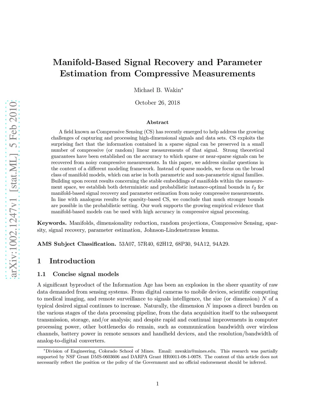 A field known as Compressive Sensing (CS) has recently emerged to help address the growing challenges of capturing and processing high-dimensional signals and data sets. CS exploits the surprising fact that the information contained in a sparse signal can be preserved in a small number of compressive (or random) linear measurements of that signal. Strong theoretical guarantees have been established on the accuracy to which sparse or near-sparse signals can be recovered from noisy compressive measurements. In this paper, we address similar questions in the context of a different modeling framework. Instead of sparse models, we focus on the broad class of manifold models, which can arise in both parametric and non-parametric signal families. Building upon recent results concerning the stable embeddings of manifolds within the measurement space, we establish both deterministic and probabilistic instance-optimal bounds in for manifold-based signal recovery and parameter estimation from noisy compressive measurements. In line with analogous results for sparsity-based CS, we conclude that much stronger bounds are possible in the probabilistic setting. Our work supports the growing empirical evidence that manifold-based models can be used with high accuracy in compressive signal processing.