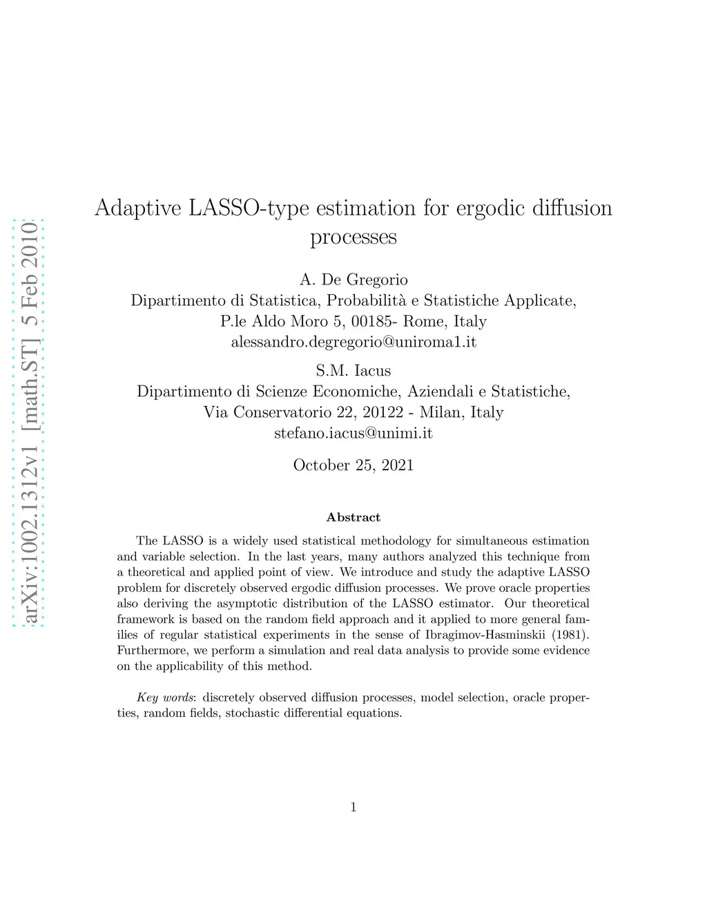 The LASSO is a widely used statistical methodology for simultaneous estimation and variable selection. In the last years, many authors analyzed this technique from a theoretical and applied point of view. We introduce and study the adaptive LASSO problem for discretely observed ergodic diffusion processes. We prove oracle properties also deriving the asymptotic distribution of the LASSO estimator. Our theoretical framework is based on the random field approach and it applied to more general families of regular statistical experiments in the sense of Ibragimov-Hasminskii (1981). Furthermore, we perform a simulation and real data analysis to provide some evidence on the applicability of this method.