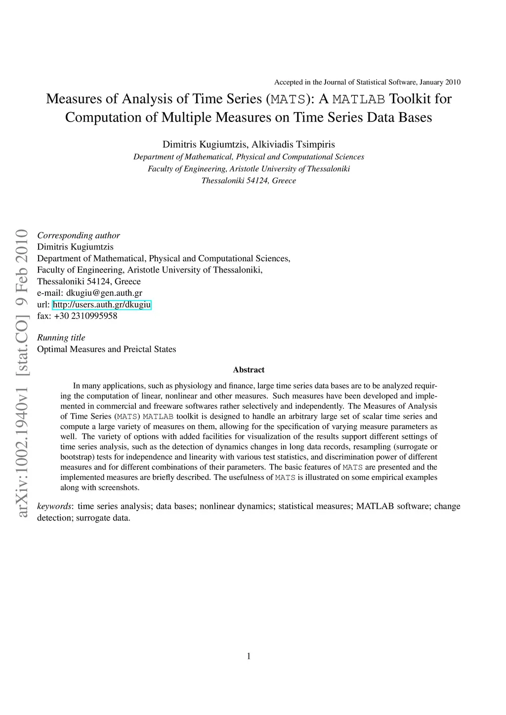 Measures of Analysis of Time Series (MATS): A MATLAB Toolkit for