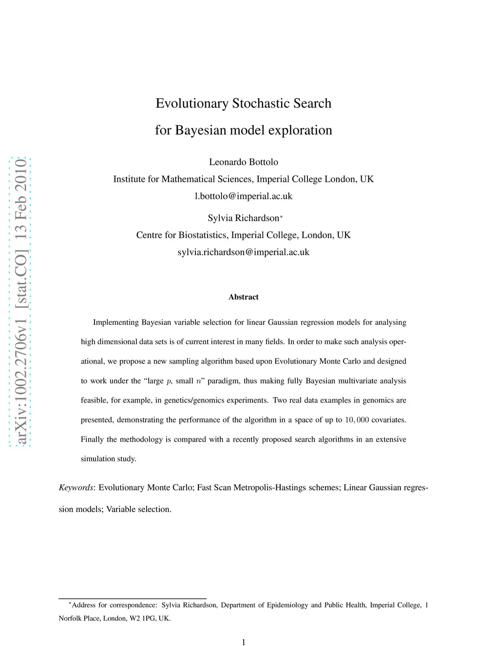 Evolutionary Stochastic Search for Bayesian model exploration