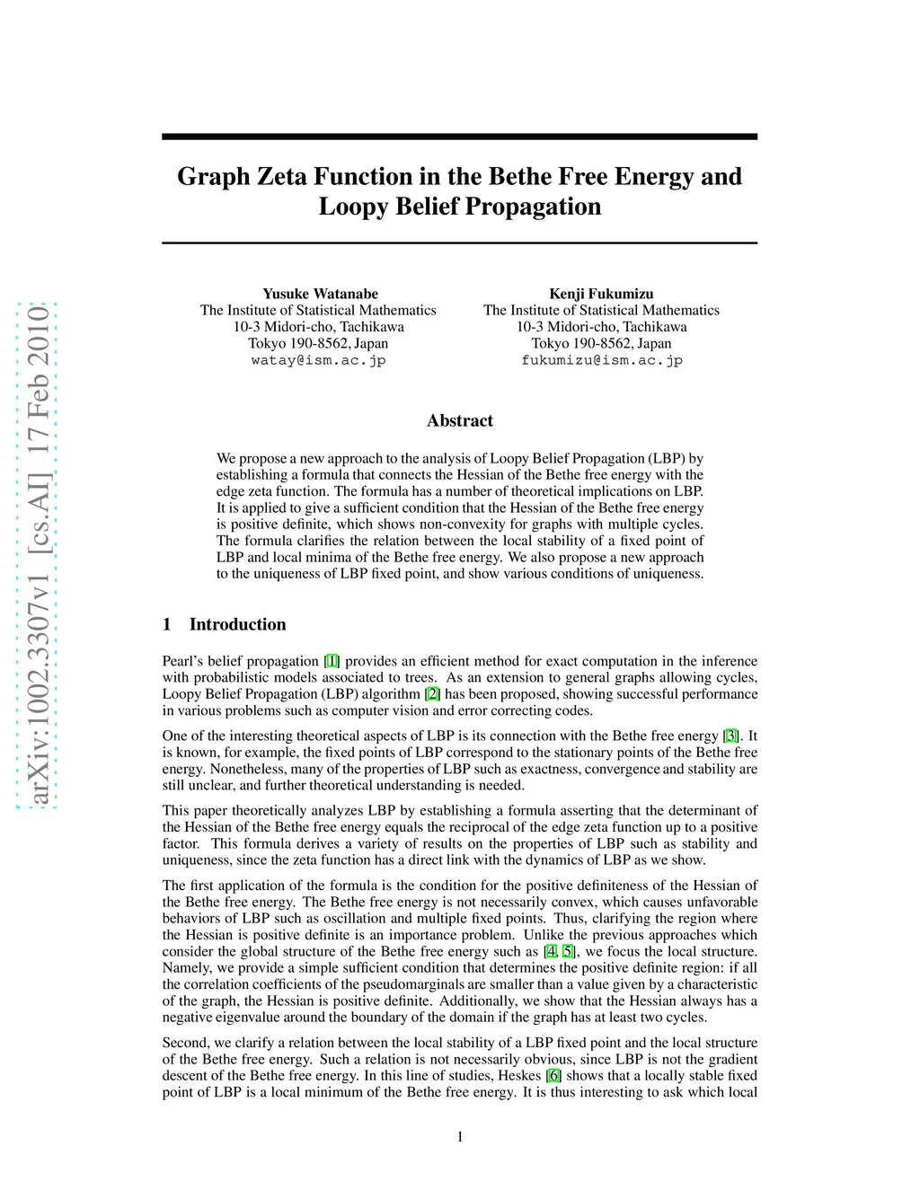 We propose a new approach to the analysis of Loopy Belief Propagation (LBP) by establishing a formula that connects the Hessian of the Bethe free energy with the edge zeta function. The formula has a number of theoretical implications on LBP. It is applied to give a sufficient condition that the Hessian of the Bethe free energy is positive definite, which shows non-convexity for graphs with multiple cycles. The formula clarifies the relation between the local stability of a fixed point of LBP and local minima of the Bethe free energy. We also propose a new approach to the uniqueness of LBP fixed point, and show various conditions of uniqueness.
