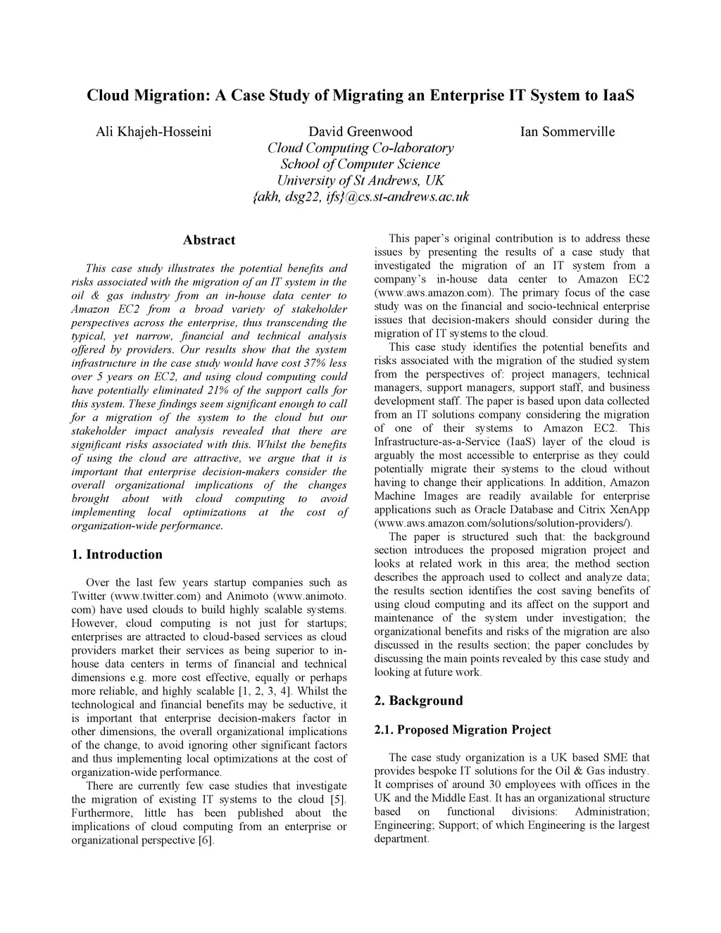 This case study illustrates the potential benefits and risks associated with the migration of an IT system in the oil & gas industry from an in-house data center to Amazon EC2 from a broad variety of stakeholder perspectives across the enterprise, thus transcending the typical, yet narrow, financial and technical analysis offered by providers. Our results show that the system infrastructure in the case study would have cost 37% less over 5 years on EC2, and using cloud computing could have potentially eliminated 21% of the support calls for this system. These findings seem significant enough to call for a migration of the system to the cloud but our stakeholder impact analysis revealed that there are significant risks associated with this. Whilst the benefits of using the cloud are attractive, we argue that it is important that enterprise decision-makers consider the overall organizational implications of the changes brought about with cloud computing to avoid implementing local optimizations at the cost of organization-wide performance.