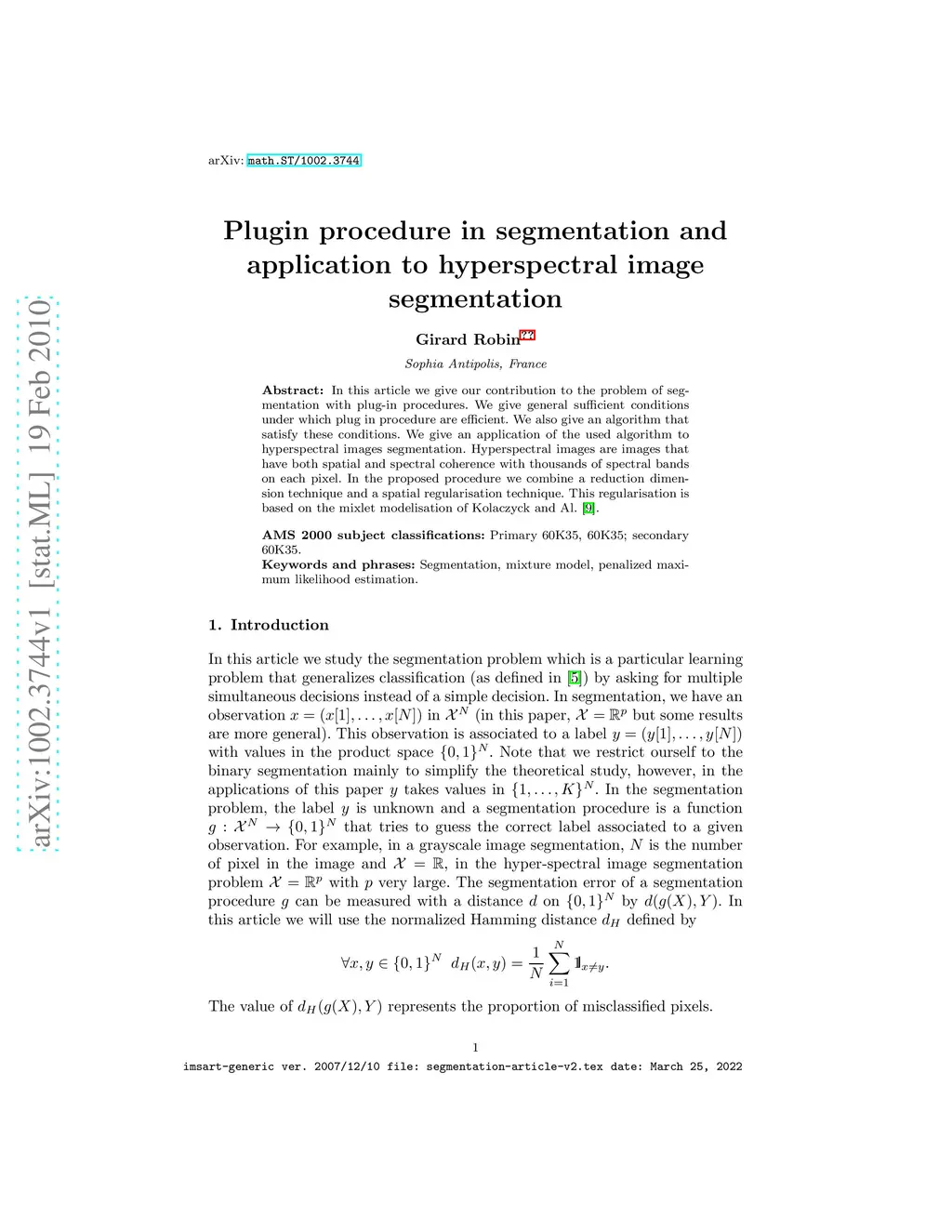 Plugin procedure in segmentation and application to hyperspectral image