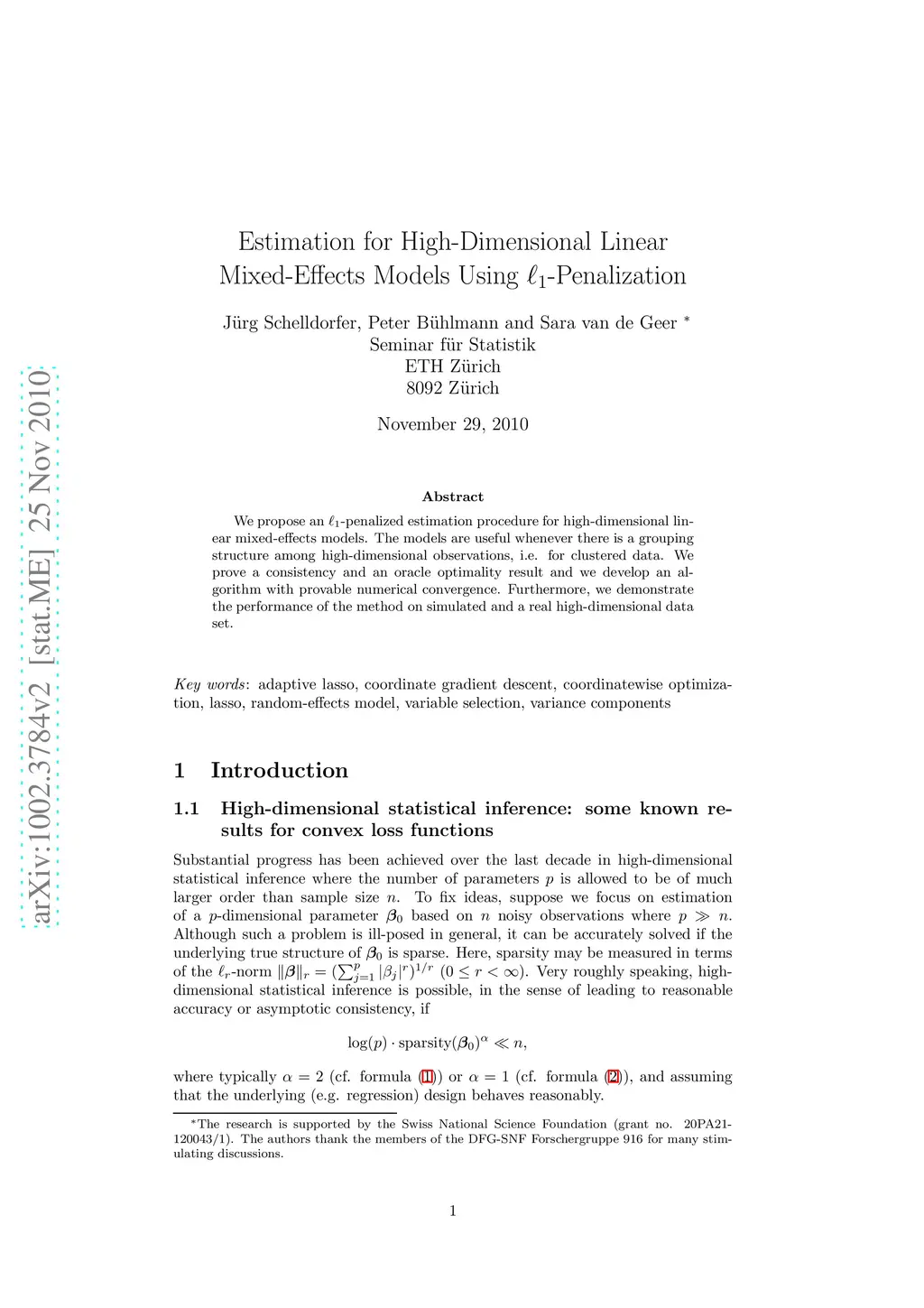 We propose an -penalized estimation procedure for high-dimensional linear mixed-effects models. The models are useful whenever there is a grouping structure among high-dimensional observations, i.e. for clustered data. We prove a consistency and an oracle optimality result and we develop an algorithm with provable numerical convergence. Furthermore, we demonstrate the performance of the method on simulated and a real high-dimensional data set.