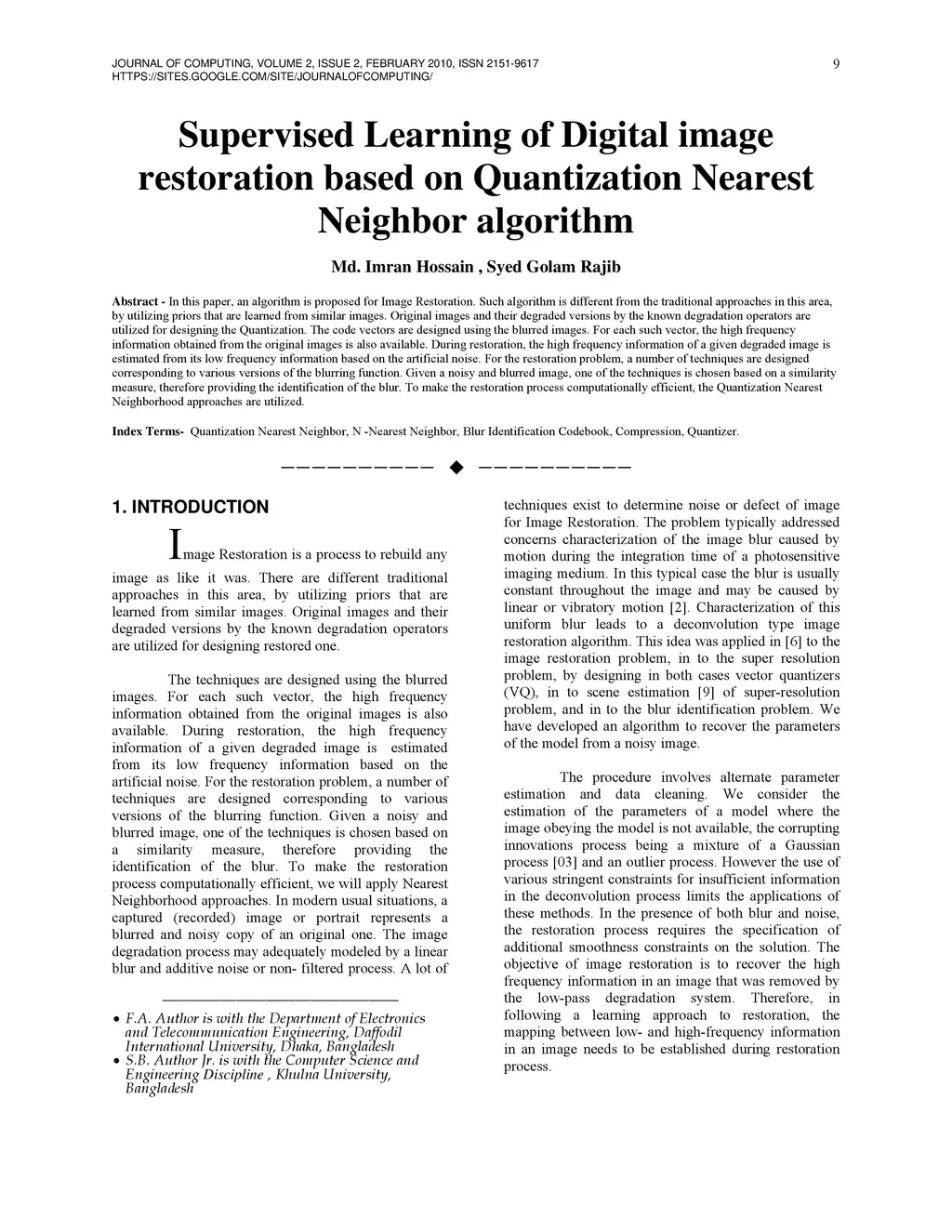 In this paper, an algorithm is proposed for Image Restoration. Such algorithm is different from the traditional approaches in this area, by utilizing priors that are learned from similar images. Original images and their degraded versions by the known degradation operators are utilized for designing the Quantization. The code vectors are designed using the blurred images. For each such vector, the high frequency information obtained from the original images is also available. During restoration, the high frequency information of a given degraded image is estimated from its low frequency information based on the artificial noise. For the restoration problem, a number of techniques are designed corresponding to various versions of the blurring function. Given a noisy and blurred image, one of the techniques is chosen based on a similarity measure, therefore providing the identification of the blur. To make the restoration process computationally efficient, the Quantization Nearest Neighborhood approaches are utilized.