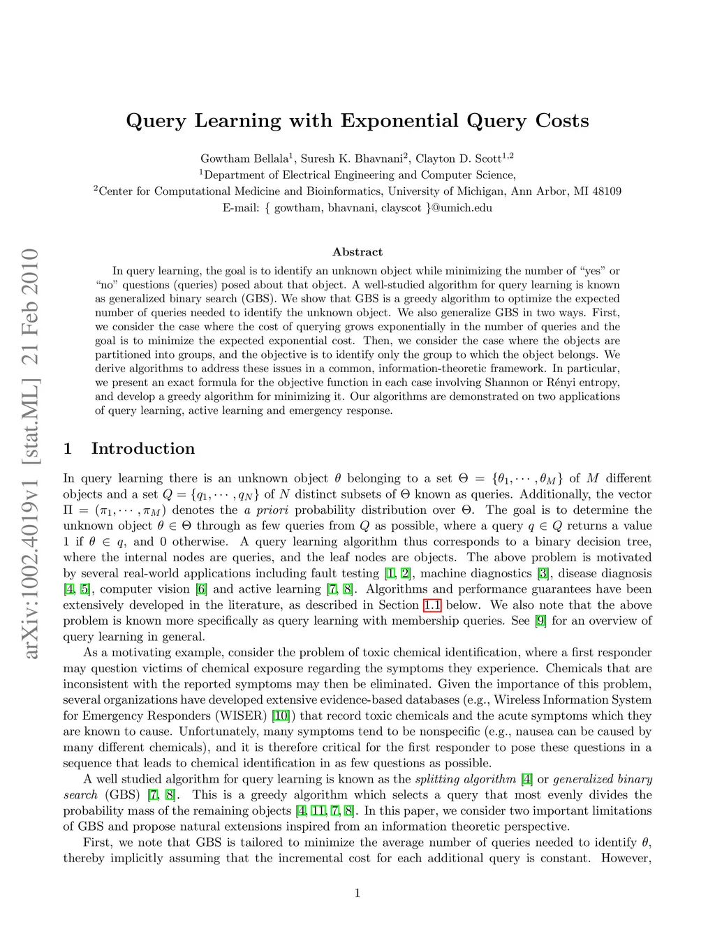 In query learning, the goal is to identify an unknown object while minimizing the number of "yes" or "no" questions (queries) posed about that object. A well-studied algorithm for query learning is known as generalized binary search (GBS). We show that GBS is a greedy algorithm to optimize the expected number of queries needed to identify the unknown object. We also generalize GBS in two ways. First, we consider the case where the cost of querying grows exponentially in the number of queries and the goal is to minimize the expected exponential cost. Then, we consider the case where the objects are partitioned into groups, and the objective is to identify only the group to which the object belongs. We derive algorithms to address these issues in a common, information-theoretic framework. In particular, we present an exact formula for the objective function in each case involving Shannon or Renyi entropy, and develop a greedy algorithm for minimizing it. Our algorithms are demonstrated on two applications of query learning, active learning and emergency response.