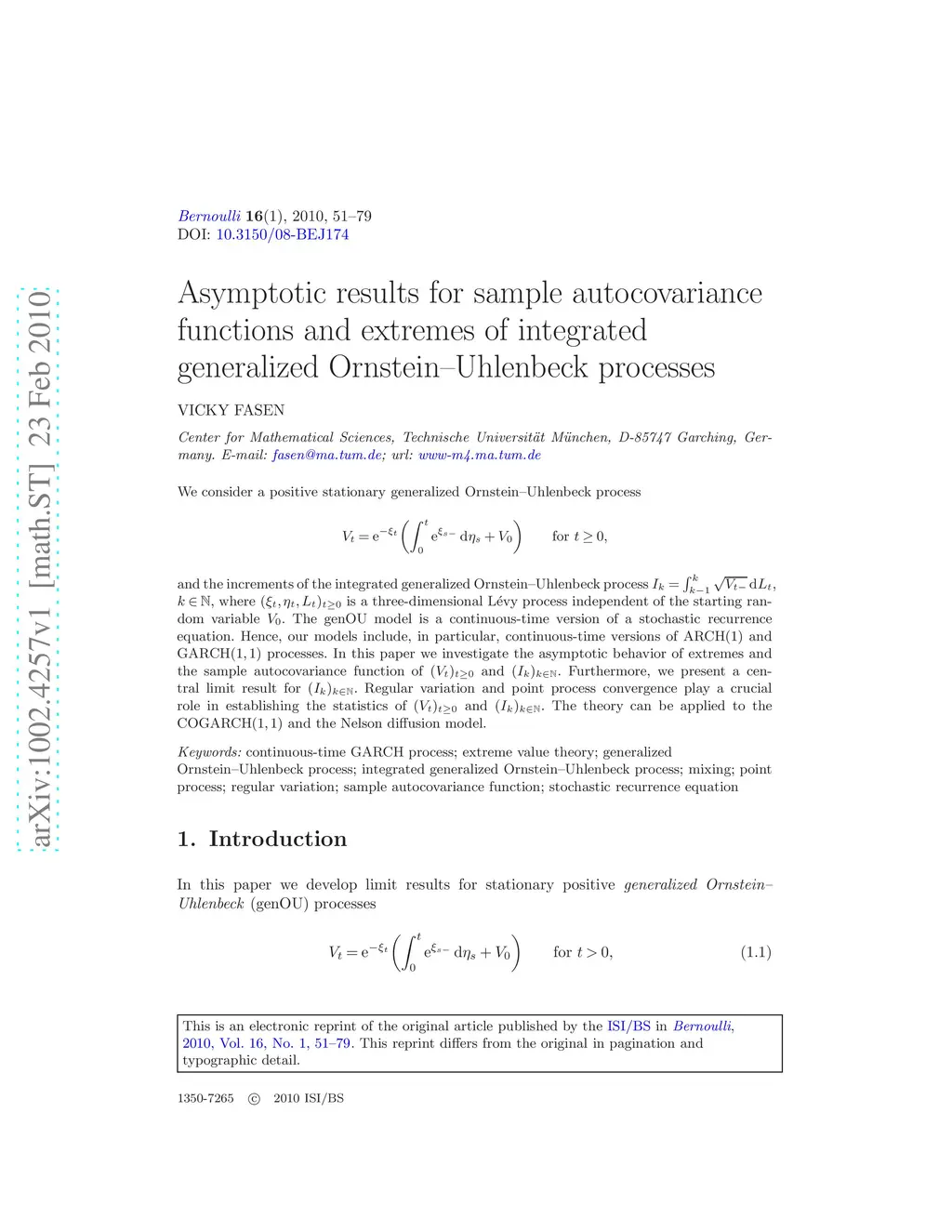 We consider a positive stationary generalized Ornstein--Uhlenbeck process \[V_t=\mathrm{e}^{-\xi_t}\biggl(\int_0^t\mathrm{e}^{\xi_{s-}}\ ,\mathrm{d}\eta_s+V_0\biggr)\qquadfor t\geq0,\] and the increments of the integrated generalized Ornstein--Uhlenbeck process , , where is a three-dimensional L\'{e}vy process independent of the starting random variable . The genOU model is a continuous-time version of a stochastic recurrence equation. Hence, our models include, in particular, continuous-time versions of and processes. In this paper we investigate the asymptotic behavior of extremes and the sample autocovariance function of and . Furthermore, we present a central limit result for . Regular variation and point process convergence play a crucial role in establishing the statistics of and . The theory can be applied to the and the Nelson diffusion model.