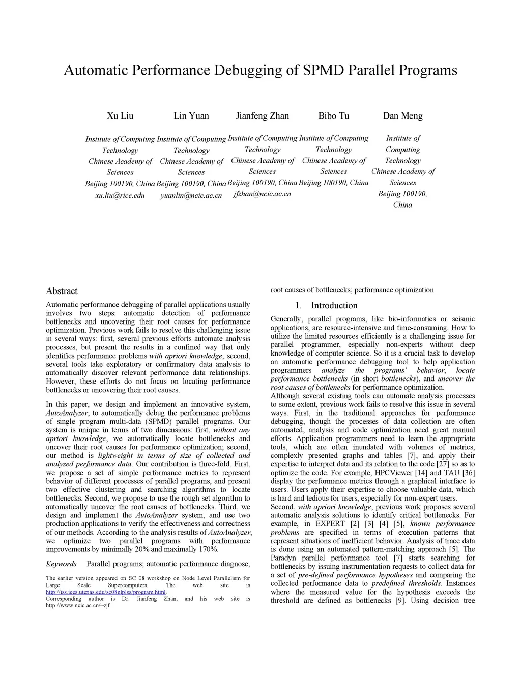 Automatic performance debugging of parallel applications usually involves two steps: automatic detection of performance bottlenecks and uncovering their root causes for performance optimization. Previous work fails to resolve this challenging issue in several ways: first, several previous efforts automate analysis processes, but present the results in a confined way that only identifies performance problems with apriori knowledge; second, several tools take exploratory or confirmatory data analysis to automatically discover relevant performance data relationships. However, these efforts do not focus on locating performance bottlenecks or uncovering their root causes. In this paper, we design and implement an innovative system, AutoAnalyzer, to automatically debug the performance problems of single program multi-data (SPMD) parallel programs. Our system is unique in terms of two dimensions: first, without any apriori knowledge, we automatically locate bottlenecks and uncover their root causes for performance optimization; second, our method is lightweight in terms of size of collected and analyzed performance data. Our contribution is three-fold. First, we propose a set of simple performance metrics to represent behavior of different processes of parallel programs, and present two effective clustering and searching algorithms to locate bottlenecks. Second, we propose to use the rough set algorithm to automatically uncover the root causes of bottlenecks. Third, we design and implement the AutoAnalyzer system, and use two production applications to verify the effectiveness and correctness of our methods. According to the analysis results of AutoAnalyzer, we optimize two parallel programs with performance improvements by minimally 20% and maximally 170%.