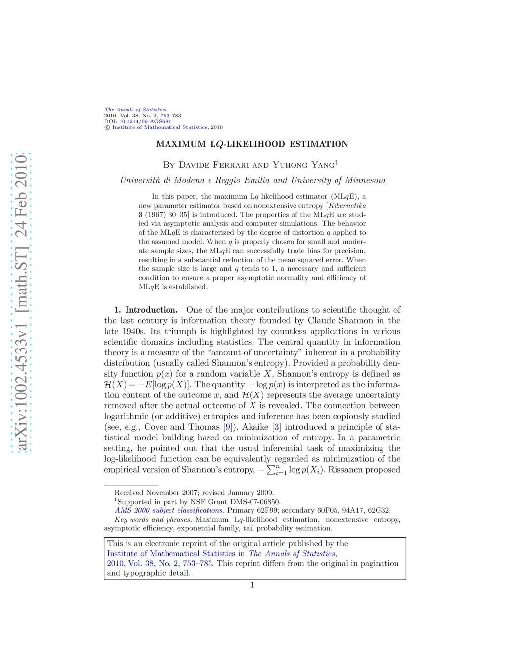 In this paper, the maximum L-likelihood estimator (MLE), a new parameter estimator based on nonextensive entropy [Kibernetika 3 (1967) 30--35] is introduced. The properties of the MLE are studied via asymptotic analysis and computer simulations. The behavior of the MLE is characterized by the degree of distortion applied to the assumed model. When is properly chosen for small and moderate sample sizes, the MLE can successfully trade bias for precision, resulting in a substantial reduction of the mean squared error. When the sample size is large and tends to 1, a necessary and sufficient condition to ensure a proper asymptotic normality and efficiency of MLE is established.
