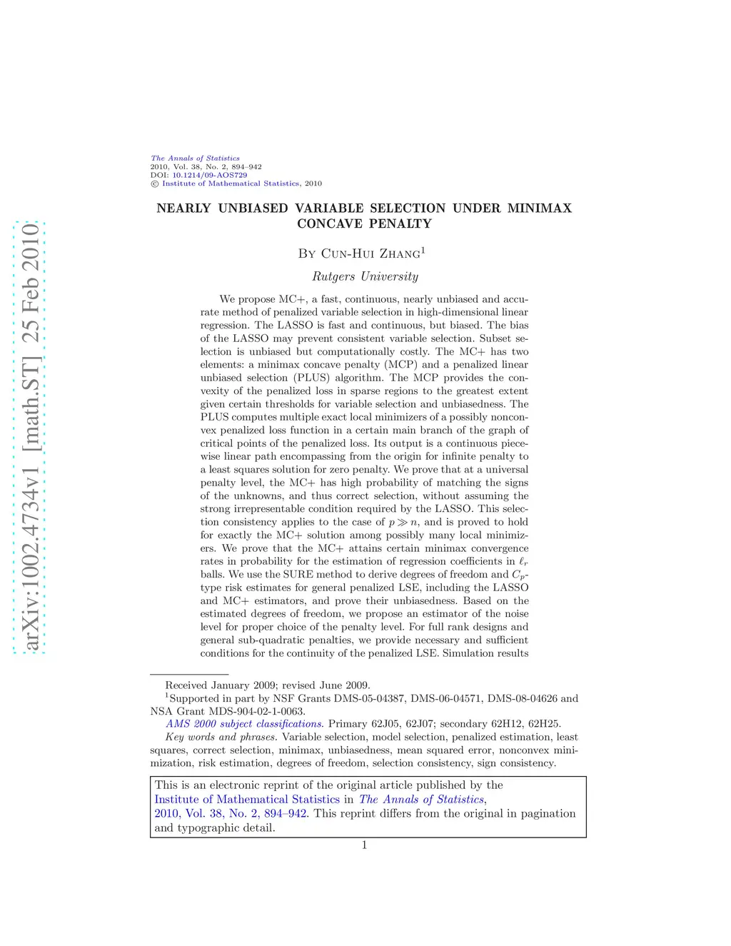 We propose MC+, a fast, continuous, nearly unbiased and accurate method of penalized variable selection in high-dimensional linear regression. The LASSO is fast and continuous, but biased. The bias of the LASSO may prevent consistent variable selection. Subset selection is unbiased but computationally costly. The MC+ has two elements: a minimax concave penalty (MCP) and a penalized linear unbiased selection (PLUS) algorithm. The MCP provides the convexity of the penalized loss in sparse regions to the greatest extent given certain thresholds for variable selection and unbiasedness. The PLUS computes multiple exact local minimizers of a possibly nonconvex penalized loss function in a certain main branch of the graph of critical points of the penalized loss. Its output is a continuous piecewise linear path encompassing from the origin for infinite penalty to a least squares solution for zero penalty. We prove that at a universal penalty level, the MC+ has high probability of matching the signs of the unknowns, and thus correct selection, without assuming the strong irrepresentable condition required by the LASSO. This selection consistency applies to the case of , and is proved to hold for exactly the MC+ solution among possibly many local minimizers. We prove that the MC+ attains certain minimax convergence rates in probability for the estimation of regression coefficients in balls. We use the SURE method to derive degrees of freedom and -type risk estimates for general penalized LSE, including the LASSO and MC+ estimators, and prove their unbiasedness. Based on the estimated degrees of freedom, we propose an estimator of the noise level for proper choice of the penalty level.