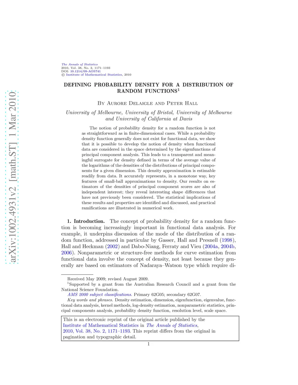The notion of probability density for a random function is not as straightforward as in finite-dimensional cases. While a probability density function generally does not exist for functional data, we show that it is possible to develop the notion of density when functional data are considered in the space determined by the eigenfunctions of principal component analysis. This leads to a transparent and meaningful surrogate for density defined in terms of the average value of the logarithms of the densities of the distributions of principal components for a given dimension. This density approximation is estimable readily from data. It accurately represents, in a monotone way, key features of small-ball approximations to density. Our results on estimators of the densities of principal component scores are also of independent interest; they reveal interesting shape differences that have not previously been considered. The statistical implications of these results and properties are identified and discussed, and practical ramifications are illustrated in numerical work.