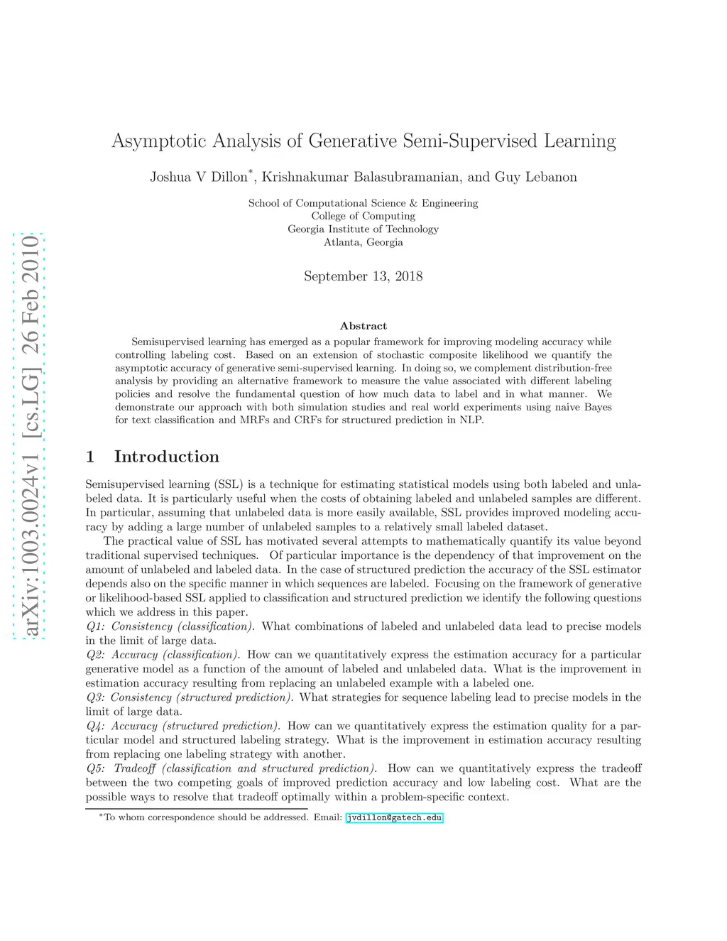 Semisupervised learning has emerged as a popular framework for improving modeling accuracy while controlling labeling cost. Based on an extension of stochastic composite likelihood we quantify the asymptotic accuracy of generative semi-supervised learning. In doing so, we complement distribution-free analysis by providing an alternative framework to measure the value associated with different labeling policies and resolve the fundamental question of how much data to label and in what manner. We demonstrate our approach with both simulation studies and real world experiments using naive Bayes for text classification and MRFs and CRFs for structured prediction in NLP.