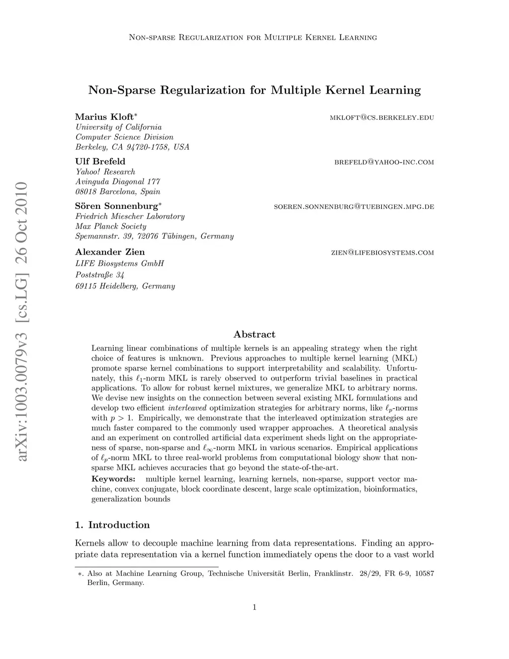 Learning linear combinations of multiple kernels is an appealing strategy when the right choice of features is unknown. Previous approaches to multiple kernel learning (MKL) promote sparse kernel combinations to support interpretability and scalability. Unfortunately, this 1-norm MKL is rarely observed to outperform trivial baselines in practical applications. To allow for robust kernel mixtures, we generalize MKL to arbitrary norms. We devise new insights on the connection between several existing MKL formulations and develop two efficient interleaved optimization strategies for arbitrary norms, like lp-norms with p>1. Empirically, we demonstrate that the interleaved optimization strategies are much faster compared to the commonly used wrapper approaches. An experiment on controlled artificial data experiment sheds light on the appropriateness of sparse, non-sparse and uniformly non-sparse MKL in various scenarios. Application of lp-norm MKL to three hard real-world problems from computational biology show that non-sparse MKL achieves accuracies that go beyond the state-of-the-art. We conclude that our improvements finally made MKL fit for deployment to practical applications: MKL now has a good chance of improving the accuracy (over a plain sum kernel) at an affordable computational cost.