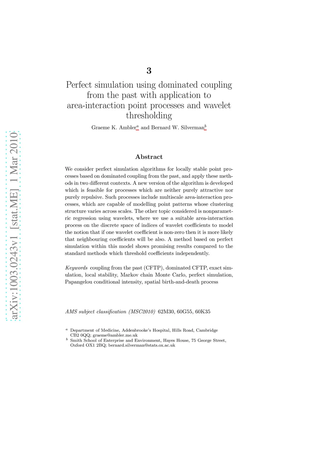 application to area-interaction point processes and wavelet thresholding