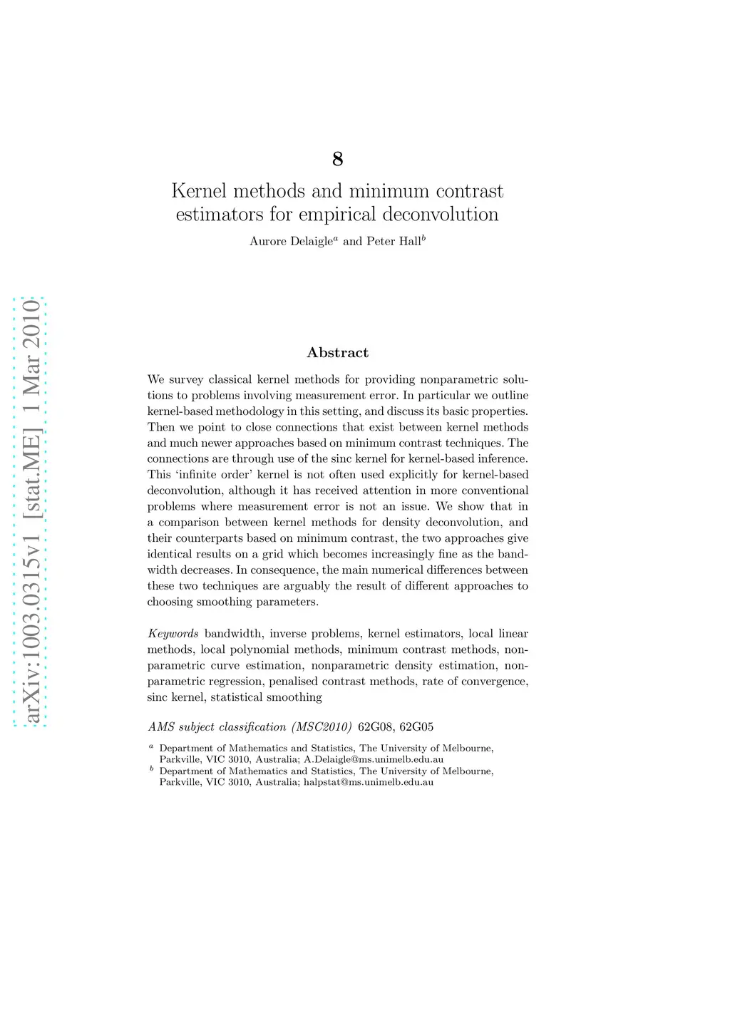 We survey classical kernel methods for providing nonparametric solutions to problems involving measurement error. In particular we outline kernel-based methodology in this setting, and discuss its basic properties. Then we point to close connections that exist between kernel methods and much newer approaches based on minimum contrast techniques. The connections are through use of the sinc kernel for kernel-based inference. This `infinite order' kernel is not often used explicitly for kernel-based deconvolution, although it has received attention in more conventional problems where measurement error is not an issue. We show that in a comparison between kernel methods for density deconvolution, and their counterparts based on minimum contrast, the two approaches give identical results on a grid which becomes increasingly fine as the bandwidth decreases. In consequence, the main numerical differences between these two techniques are arguably the result of different approaches to choosing smoothing parameters.