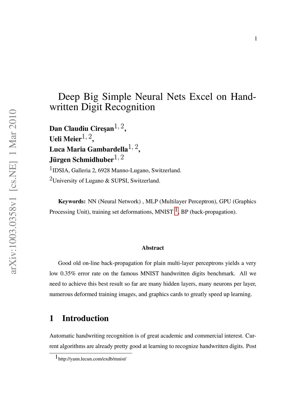 Good old on-line back-propagation for plain multi-layer perceptrons yields a very low 0.35% error rate on the famous MNIST handwritten digits benchmark. All we need to achieve this best result so far are many hidden layers, many neurons per layer, numerous deformed training images, and graphics cards to greatly speed up learning.