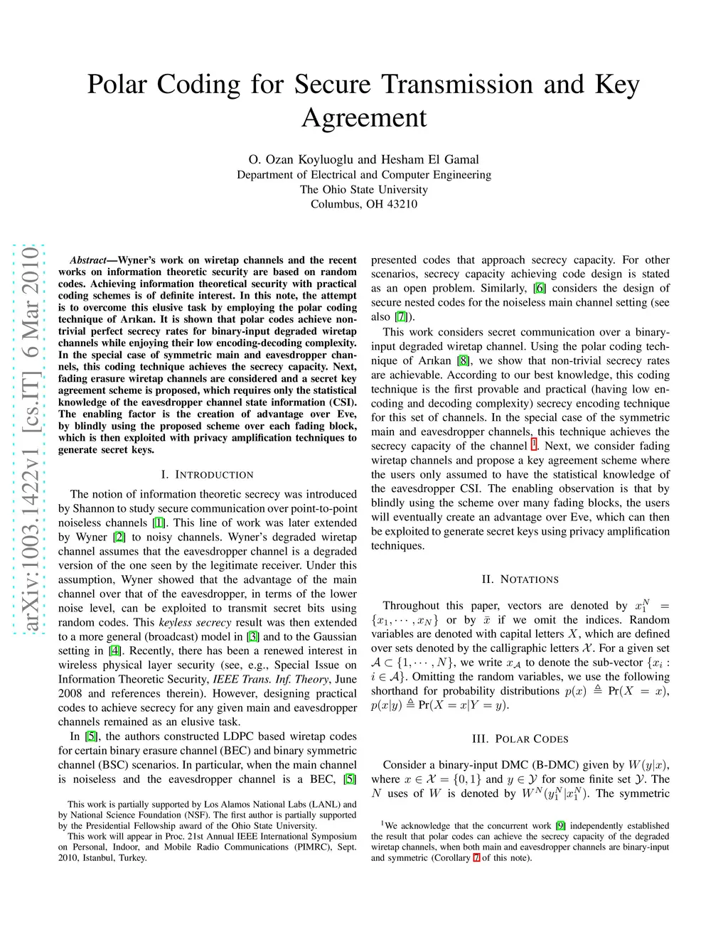 Wyner's work on wiretap channels and the recent works on information theoretic security are based on random codes. Achieving information theoretical security with practical coding schemes is of definite interest. In this note, the attempt is to overcome this elusive task by employing the polar coding technique of Ar{\i}kan. It is shown that polar codes achieve non-trivial perfect secrecy rates for binary-input degraded wiretap channels while enjoying their low encoding-decoding complexity. In the special case of symmetric main and eavesdropper channels, this coding technique achieves the secrecy capacity. Next, fading erasure wiretap channels are considered and a secret key agreement scheme is proposed, which requires only the statistical knowledge of the eavesdropper channel state information (CSI). The enabling factor is the creation of advantage over Eve, by blindly using the proposed scheme over each fading block, which is then exploited with privacy amplification techniques to generate secret keys.