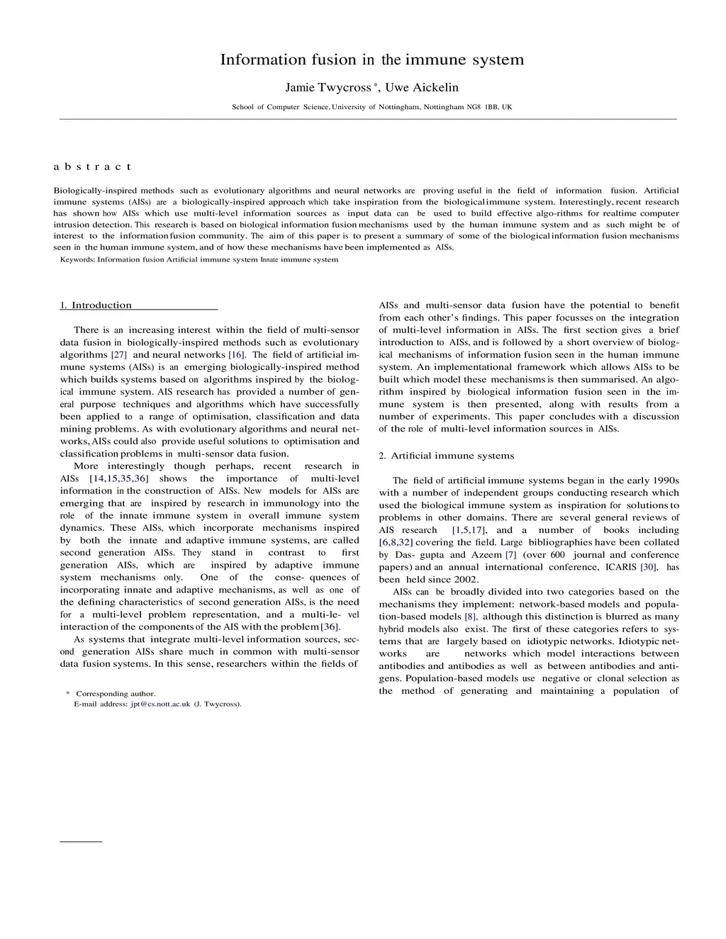 Biologically-inspired methods such as evolutionary algorithms and neural networks are proving useful in the field of information fusion. Artificial Immune Systems (AISs) are a biologically-inspired approach which take inspiration from the biological immune system. Interestingly, recent research has show how AISs which use multi-level information sources as input data can be used to build effective algorithms for real time computer intrusion detection. This research is based on biological information fusion mechanisms used by the human immune system and as such might be of interest to the information fusion community. The aim of this paper is to present a summary of some of the biological information fusion mechanisms seen in the human immune system, and of how these mechanisms have been implemented as AISs