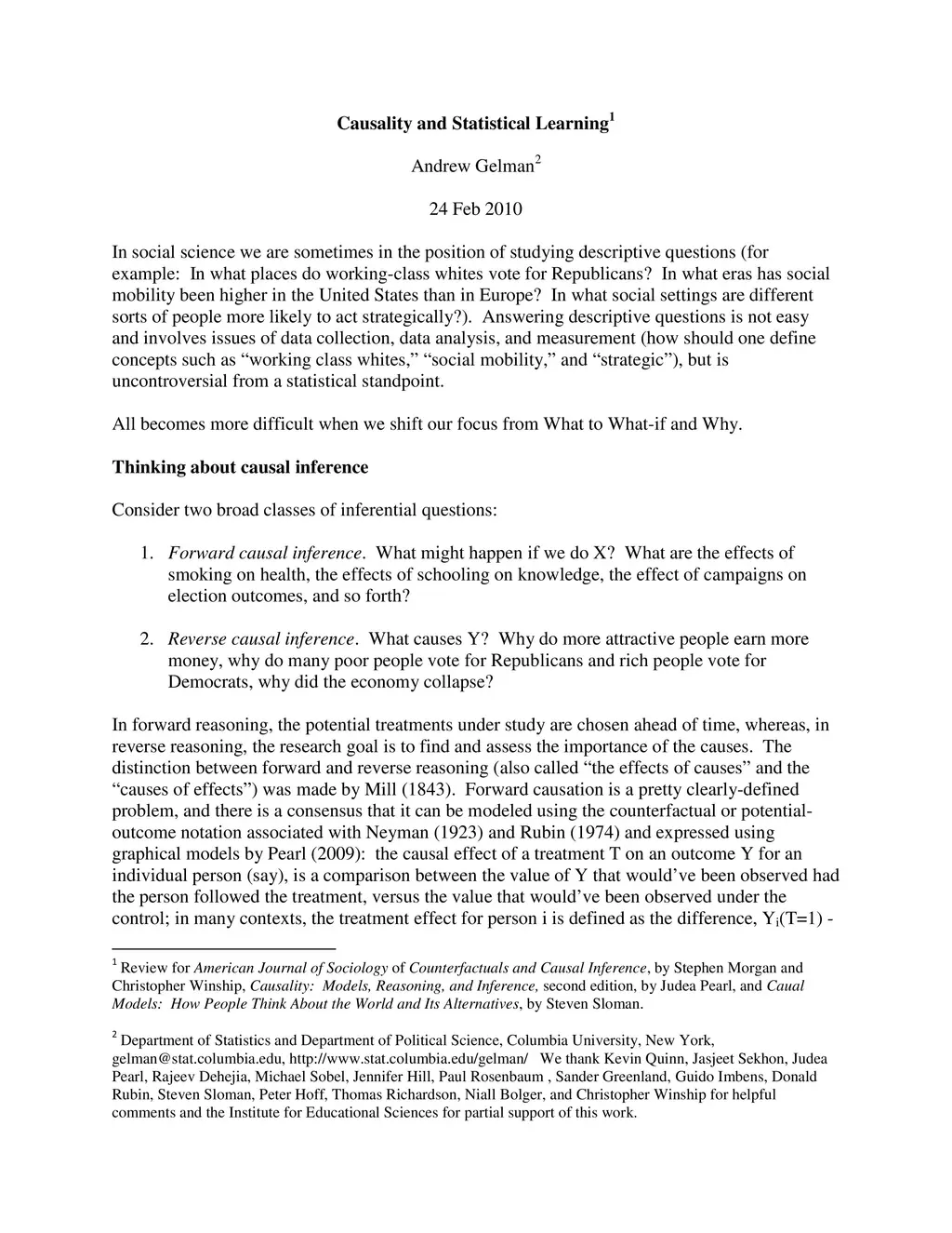 We review some approaches and philosophies of causal inference coming from sociology, economics, computer science, cognitive science, and statistics