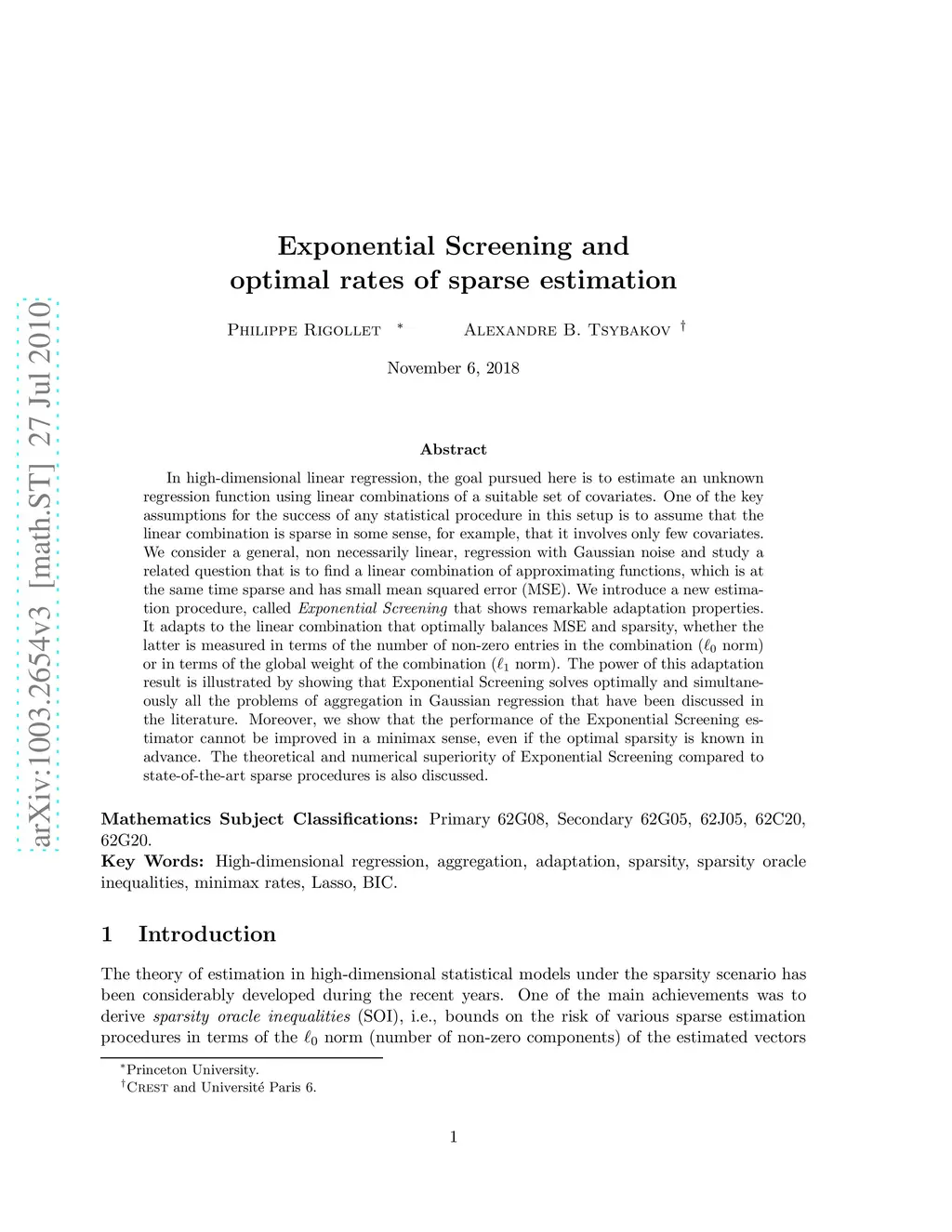 Exponential Screening and optimal rates of sparse estimation