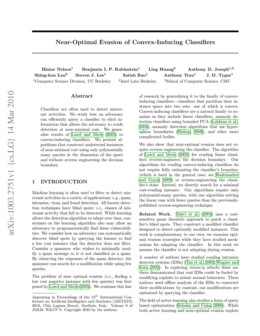 Classifiers are often used to detect miscreant activities. We study how an adversary can efficiently query a classifier to elicit information that allows the adversary to evade detection at near-minimal cost. We generalize results of Lowd and Meek (2005) to convex-inducing classifiers. We present algorithms that construct undetected instances of near-minimal cost using only polynomially many queries in the dimension of the space and without reverse engineering the decision boundary.