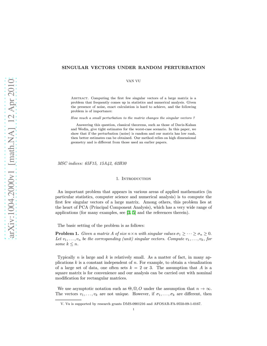 Computing the first few singular vectors of a large matrix is a problem that frequently comes up in statistics and numerical analysis. Given the presence of noise, exact calculation is hard to achieve, and the following problem is of importance: \vskip2mm \centerline {\it How much a small perturbation to the matrix changes the singular vectors ?} \vskip2mm Answering this question, classical theorems, such as those of Davis-Kahan and Wedin, give tight estimates for the worst-case scenario. In this paper, we show that if the perturbation (noise) is random and our matrix has low rank, then better estimates can be obtained. Our method relies on high dimensional geometry and is different from those used an earlier papers.
