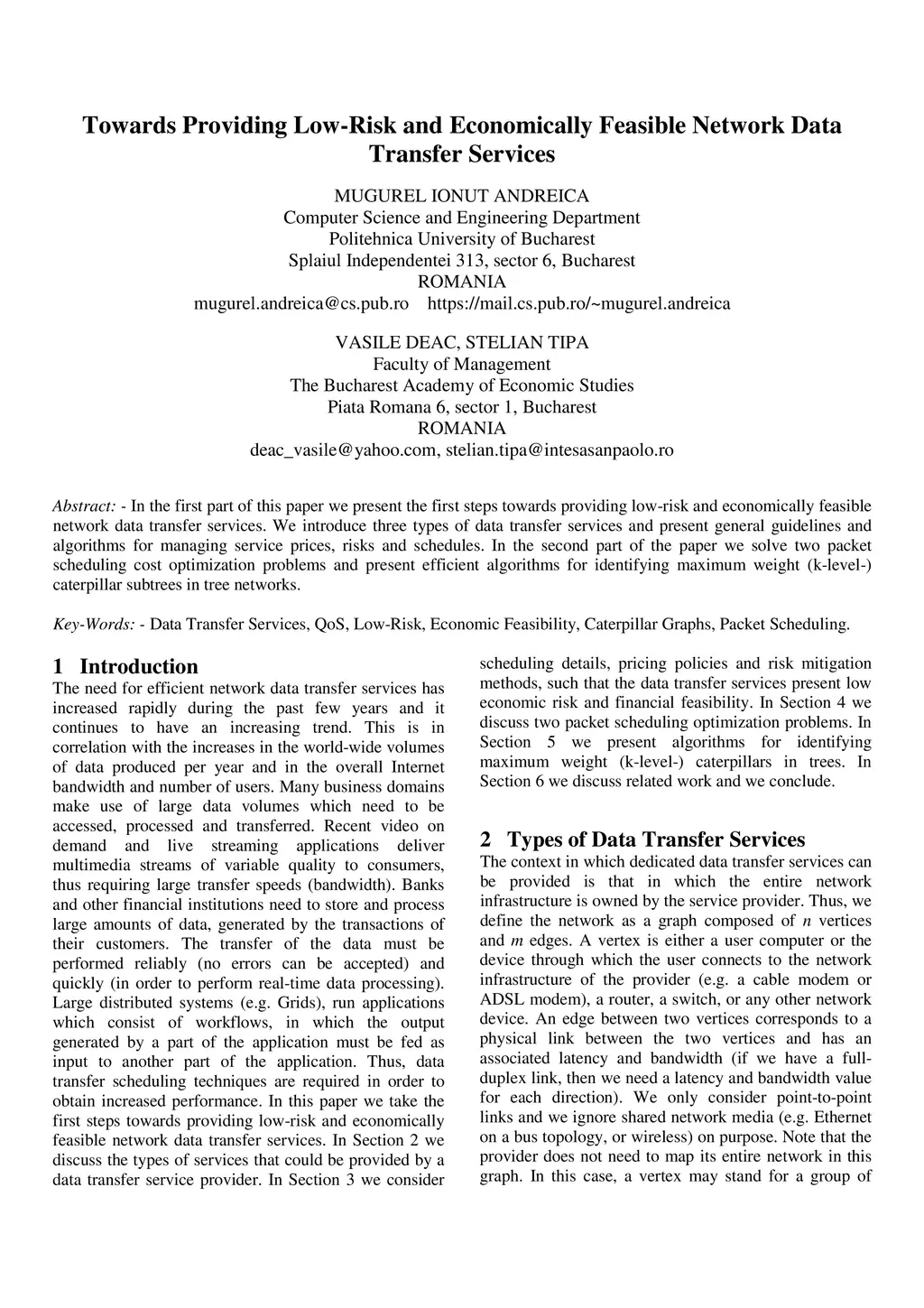 In the first part of this paper we present the first steps towards providing low-risk and economically feasible network data transfer services. We introduce three types of data transfer services and present general guidelines and algorithms for managing service prices, risks and schedules. In the second part of the paper we solve two packet scheduling cost optimization problems and present efficient algorithms for identifying maximum weight (k-level-) caterpillar subtrees in tree networks.